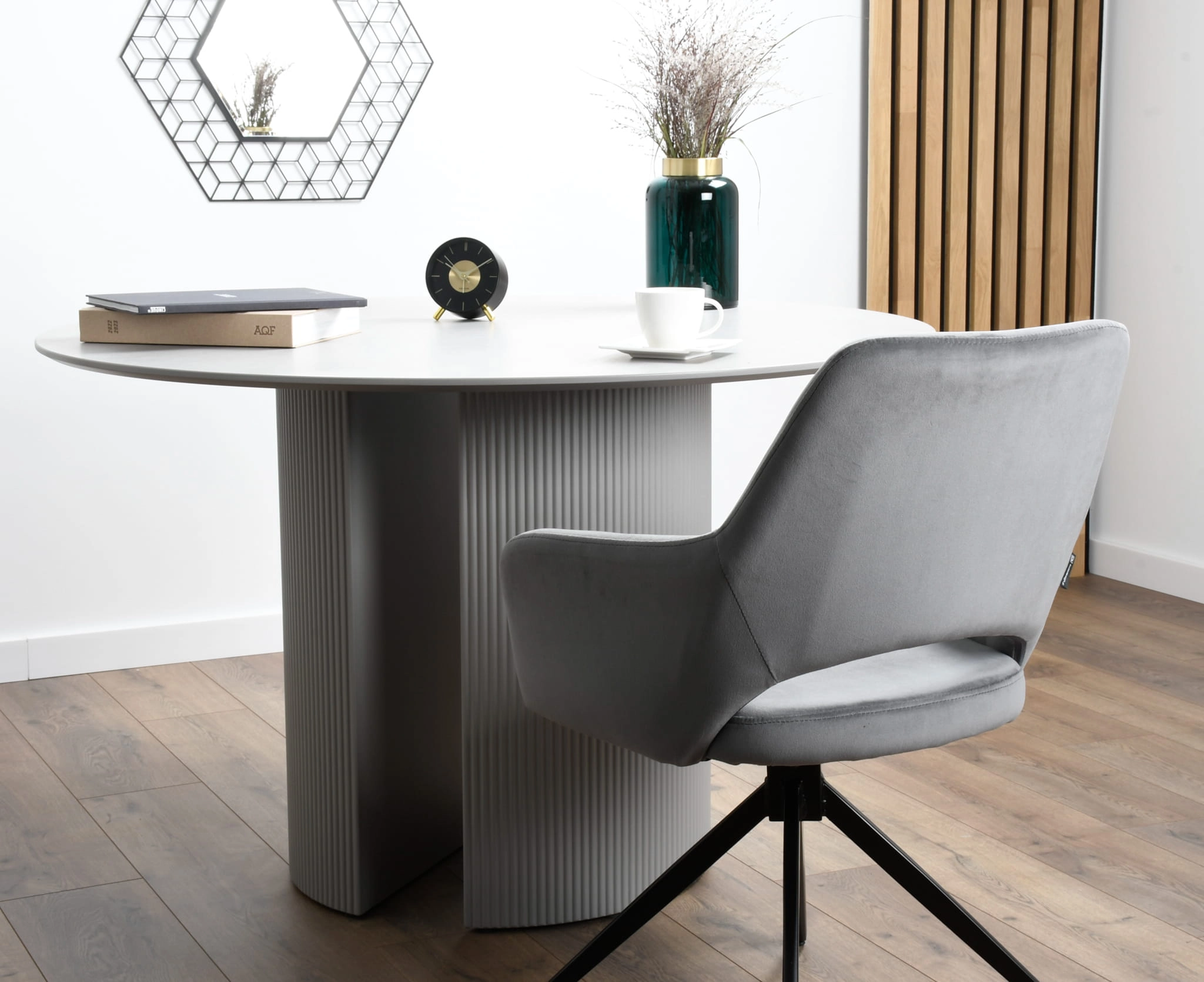 ERIM to stylowe i komfortowe krzesło tapicerowane w odcieniu szarości, które zachwyca zarówno funkcjonalnością, jak i estetyką. Wykonane z miękkiego weluru, z trwałym metalowym stelażem i praktycznym mechanizmem obrotowym 360°, doskonale sprawdzi się zarówno w domowej przestrzeni, jak i w eleganckim biurze czy nowoczesnym salonie. To połączenie designu, wygody i uniwersalności, które docenisz każdego dnia.