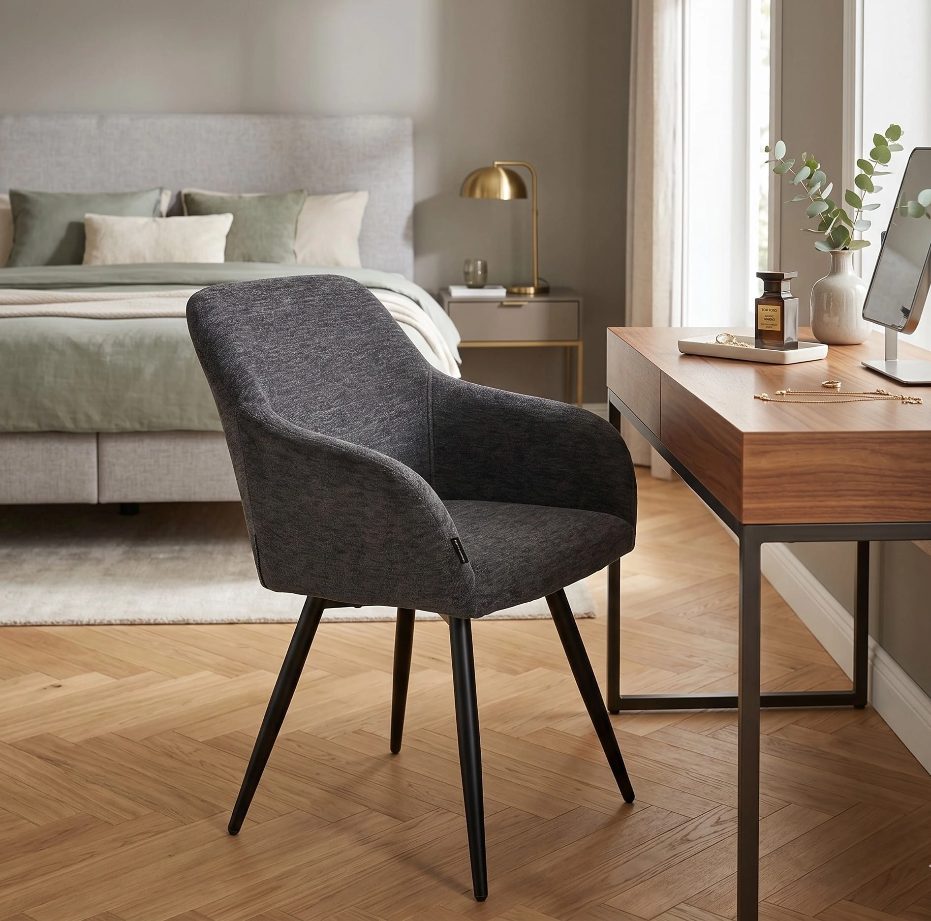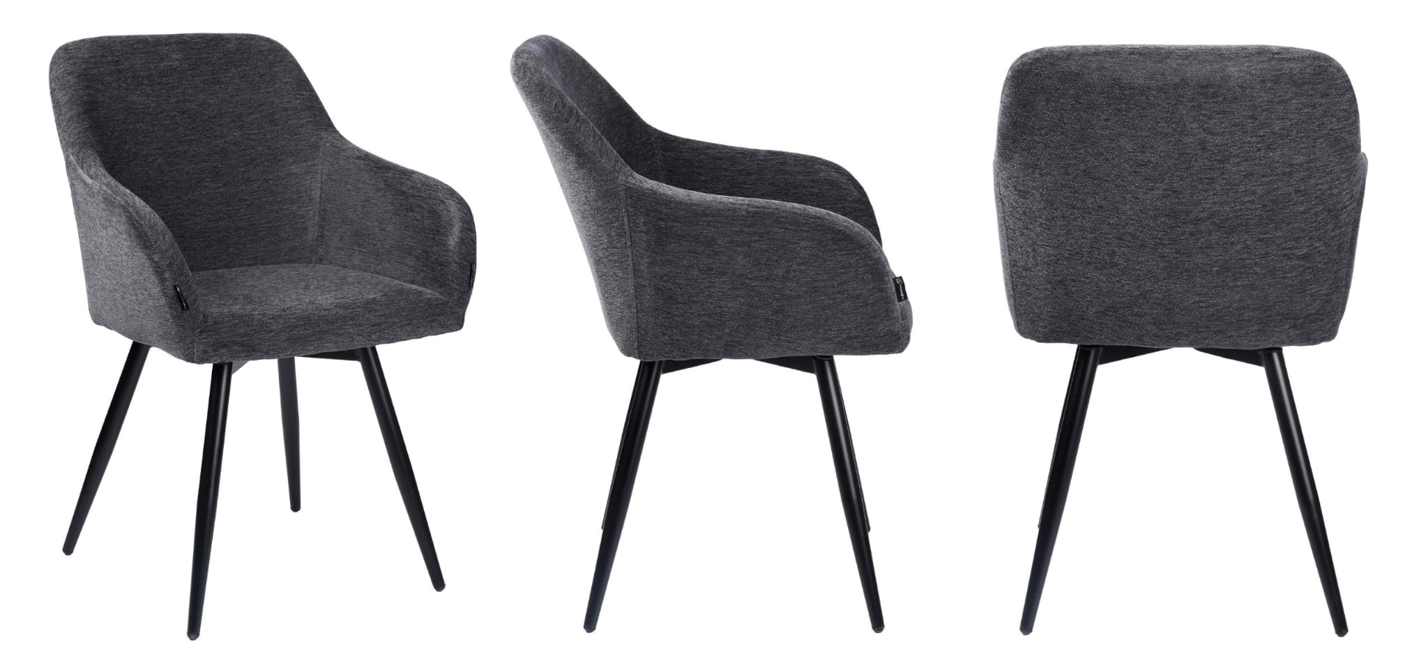 Krzesło tapicerowane ESMO od exitodesign to idealne połączenie komfortu i nowoczesnej estetyki. Dzięki mechanizmowi obrotowemu 360° oraz miękkiej tapicerce w kolorze grafitowym, świetnie sprawdzi się zarówno przy biurku, jak i przy stole w jadalni. Czarne metalowe nogi podkreślają jego nowoczesny styl i pasują do wnętrz w stylu industrialnym lub glamour.