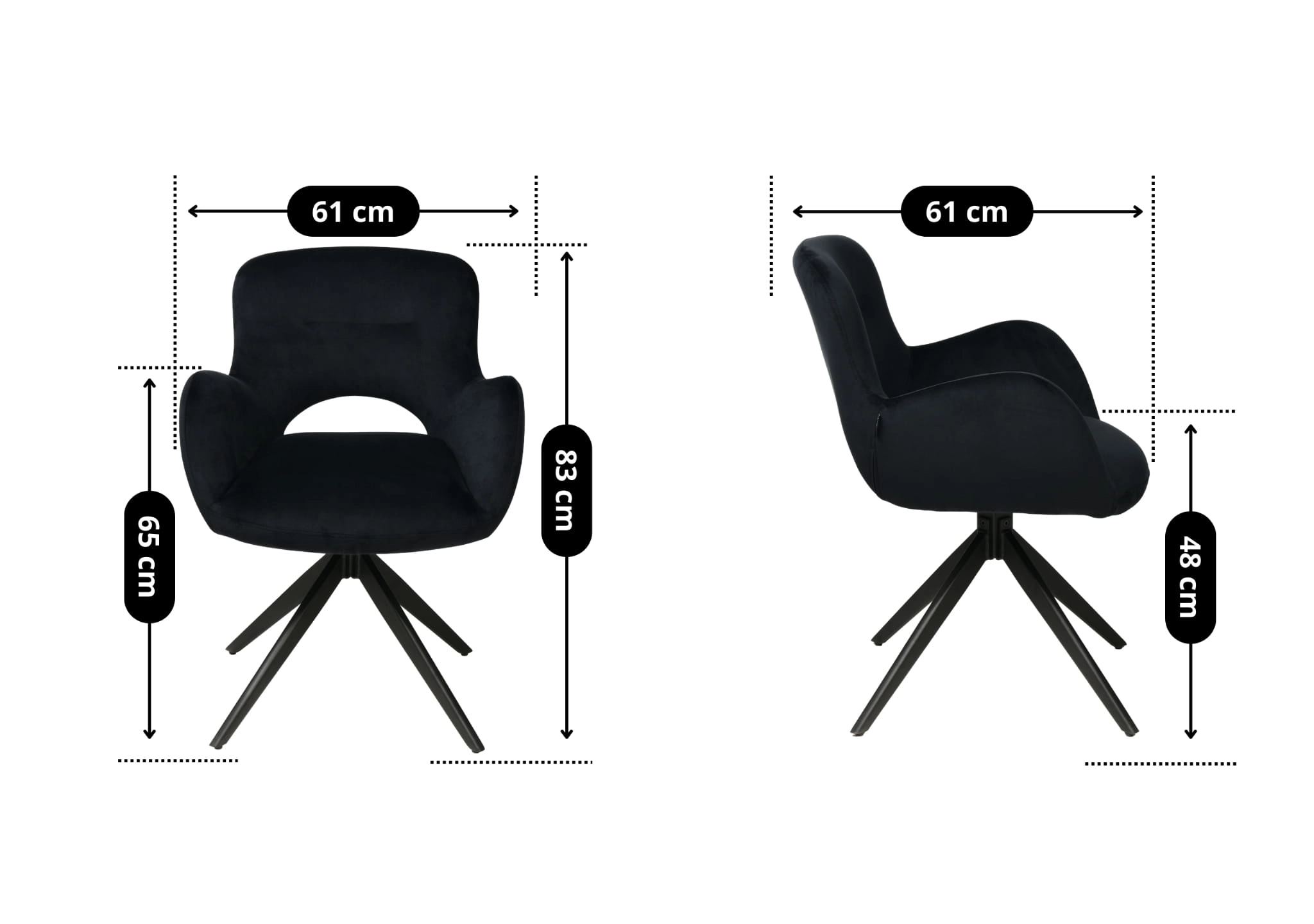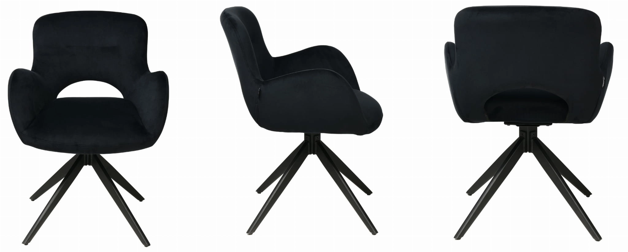 Czarna tapicerka z weluru nie tylko pięknie wygląda, ale również jest przyjemna w dotyku i łatwa w pielęgnacji. Metalowe nogi w tym samym kolorze dodają mu charakteru i gwarantują trwałość. Wyprofilowane oparcie oraz miękka pianka tapicerska sprawiają, że siedzenie staje się prawdziwą przyjemnością – nawet przez wiele godzin.
