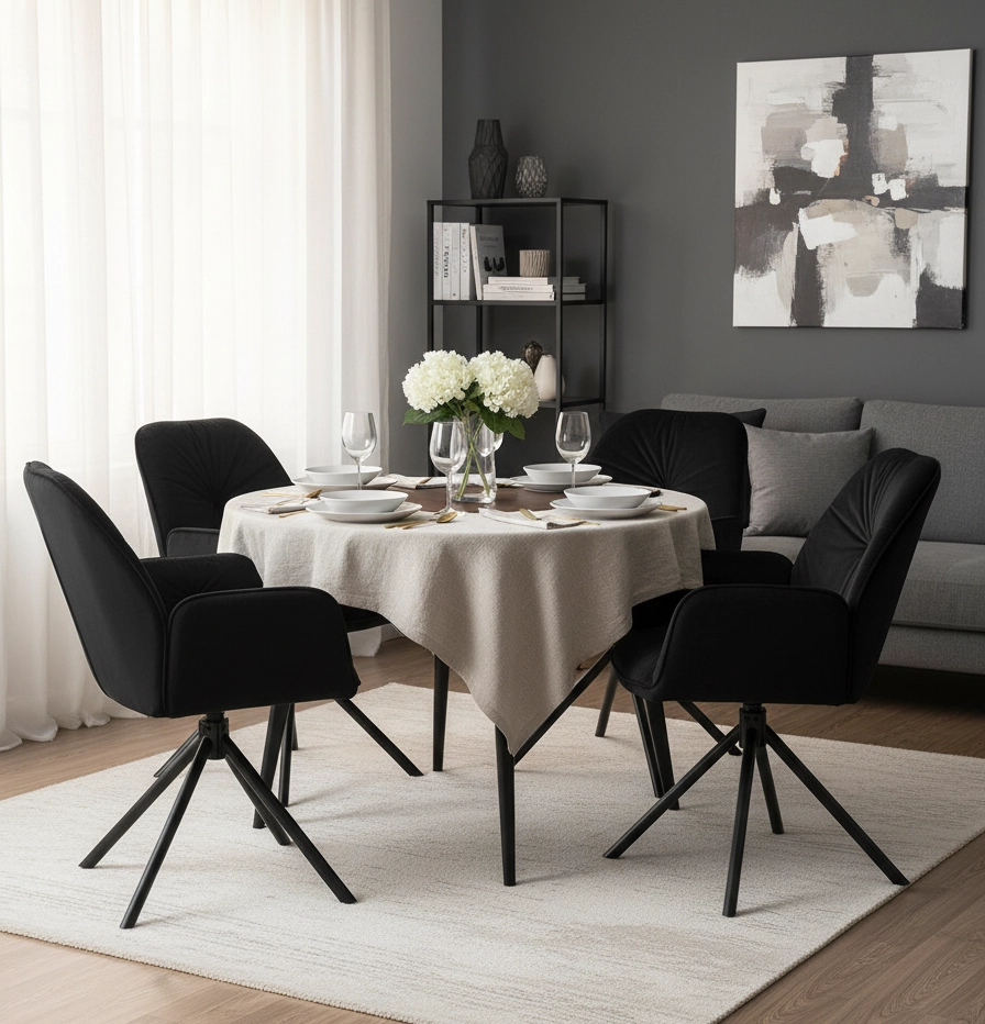Krzesło tapicerowane obrotowe KOEN to idealne połączenie komfortu, elegancji i nowoczesnego designu. Pokryte miękkim welurem, z ergonomicznym siedziskiem, stylowymi podłokietnikami i praktycznym mechanizmem obrotowym 360°, doskonale sprawdzi się jako krzesło do salonu, jadalni, biura lub przy toaletce. Jego uniwersalny czarny kolor wkomponuje się w wiele aranżacji, a solidne wykonanie gwarantuje długie użytkowanie. Szukasz mebla, który podkreśli charakter Twojego wnętrza i zapewni wygodę na co dzień? Właśnie go znalazłeś!