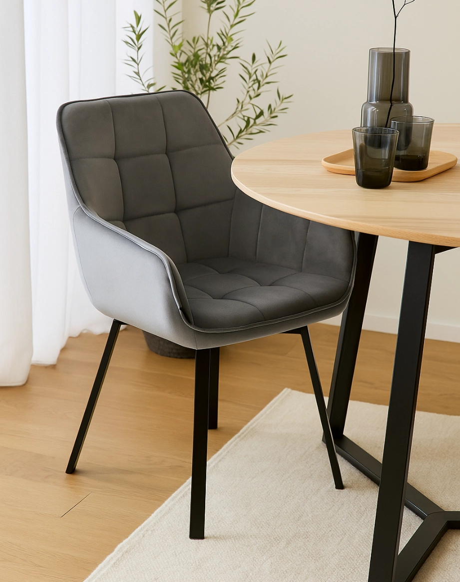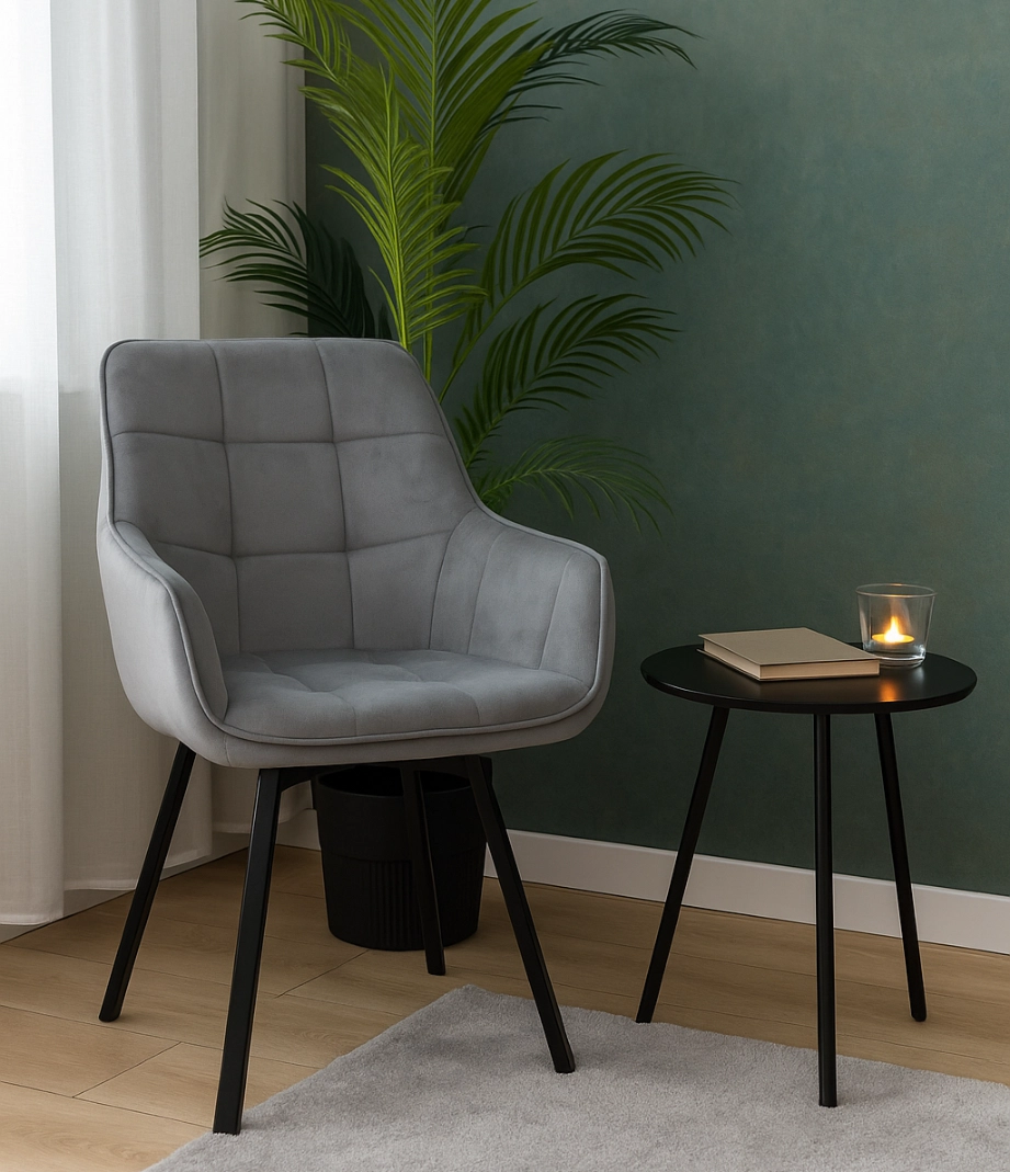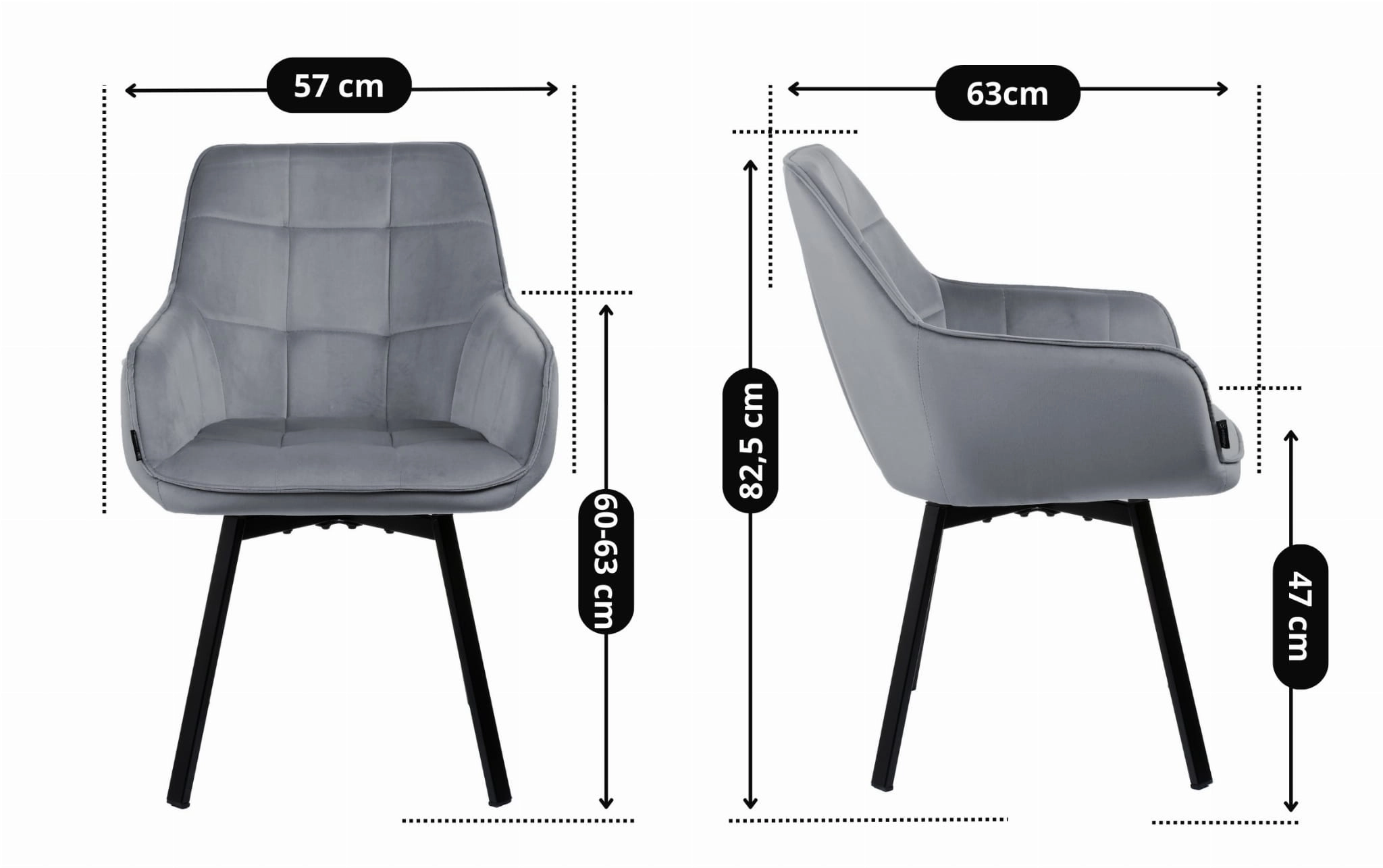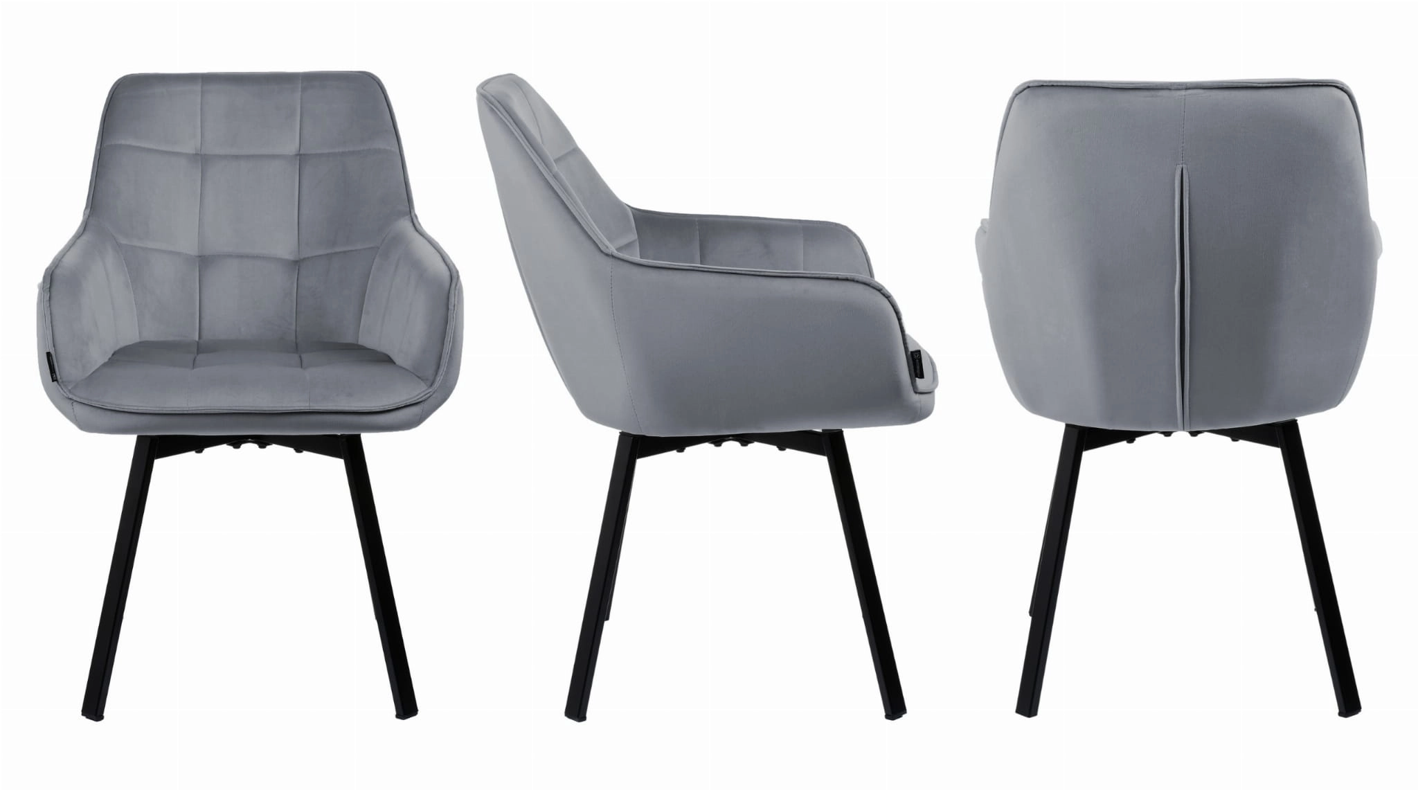 Krzesło tapicerowane TOGO w kolorze szarym to propozycja dla osób, które cenią sobie subtelne odcienie, nowoczesny design i wysoką jakość wykonania. Tapicerka z miękkiego weluru nie tylko prezentuje się elegancko, ale także gwarantuje komfort siedzenia na co dzień. Funkcja obrotu 360° sprawia, że krzesło jest niezwykle praktyczne – idealne do pracy przy biurku, relaksu w salonie czy przy toaletce.