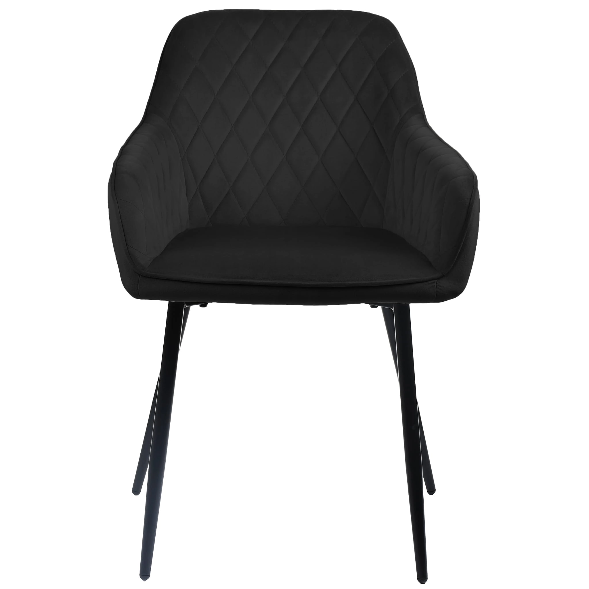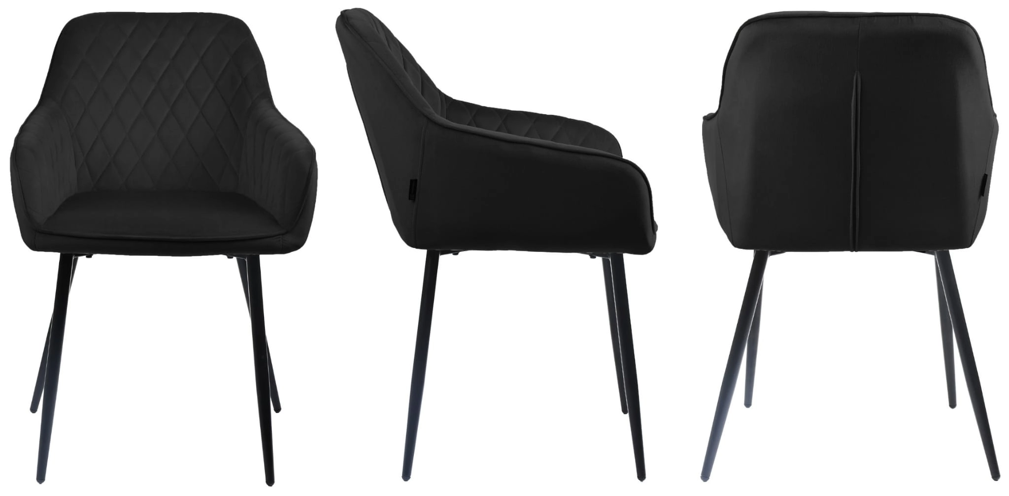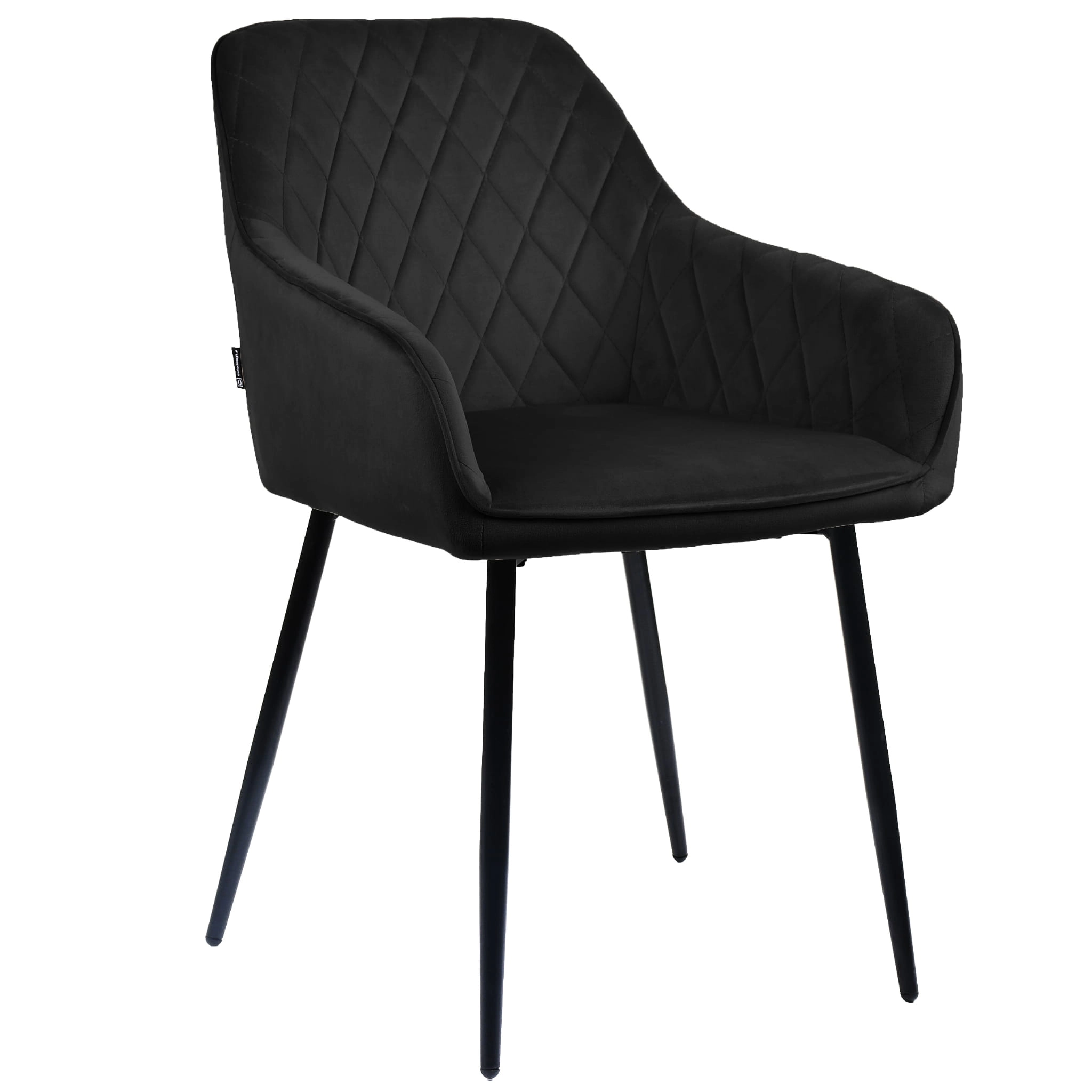Krzesło tapicerowane RELLO łączy welur o miękkim chwycie z metalowym stelażem i smukłymi nogami. To nowoczesne krzesło do jadalni i salonu w eleganckiej czerni, które zachwyca pikowanym oparciem i komfortem siedzenia przy stole.