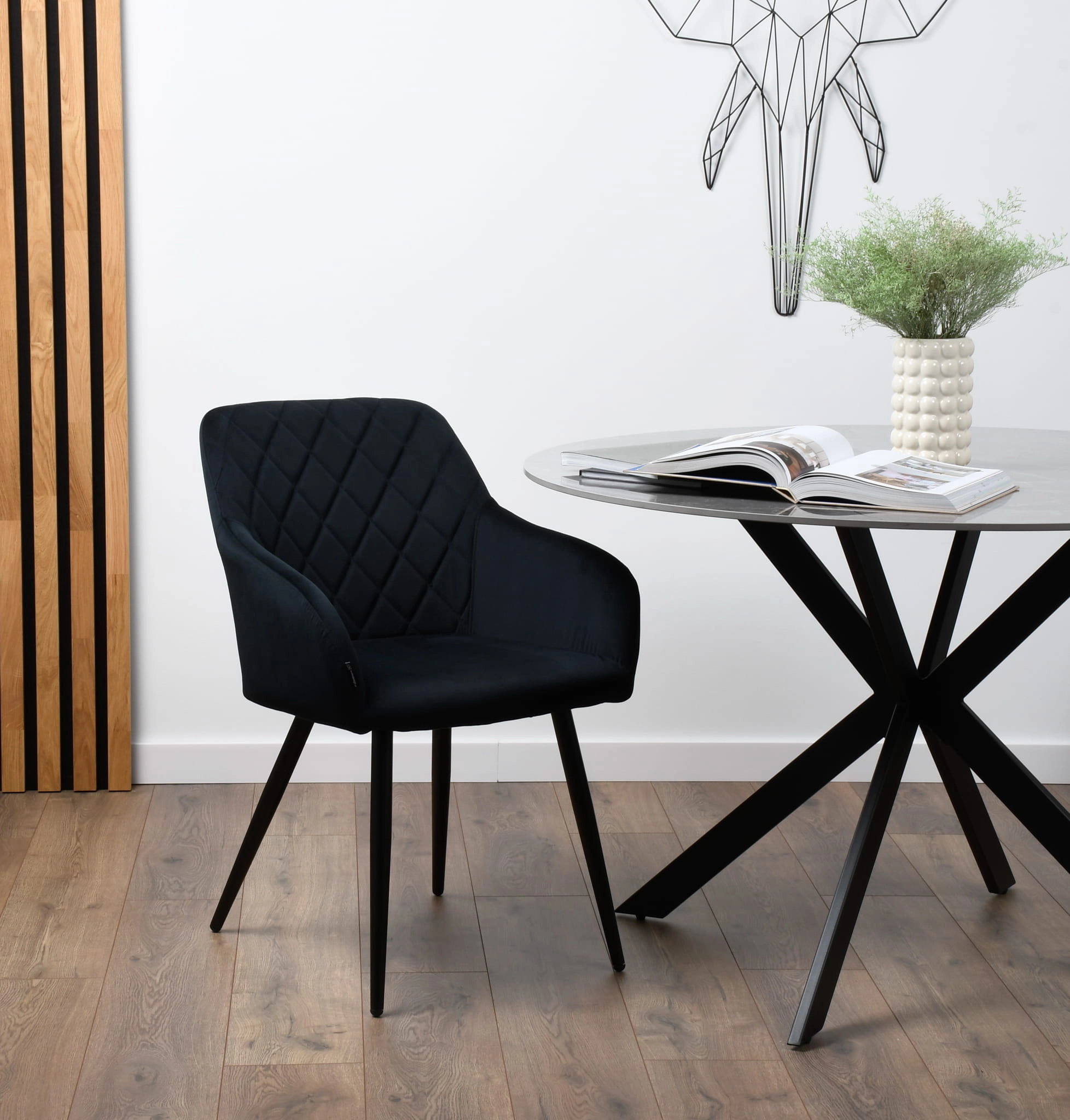 Krzesło MILTON to więcej niż tylko miejsce do siedzenia – to stylowy akcent, który dopełni każde nowoczesne wnętrze. Welurowa tapicerka w eleganckim czarnym kolorze przyciąga wzrok i zachwyca klasyką, a metalowe nogi nadają mu współczesny, designerski charakter.