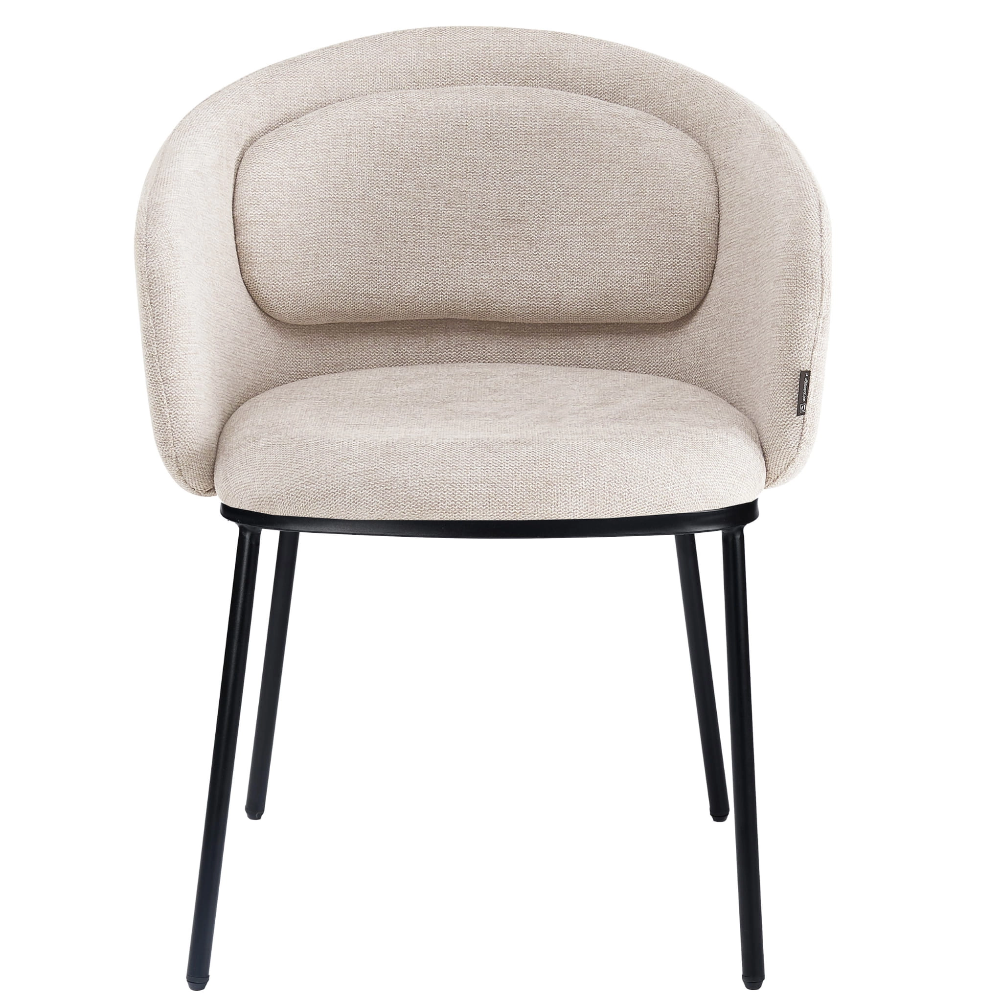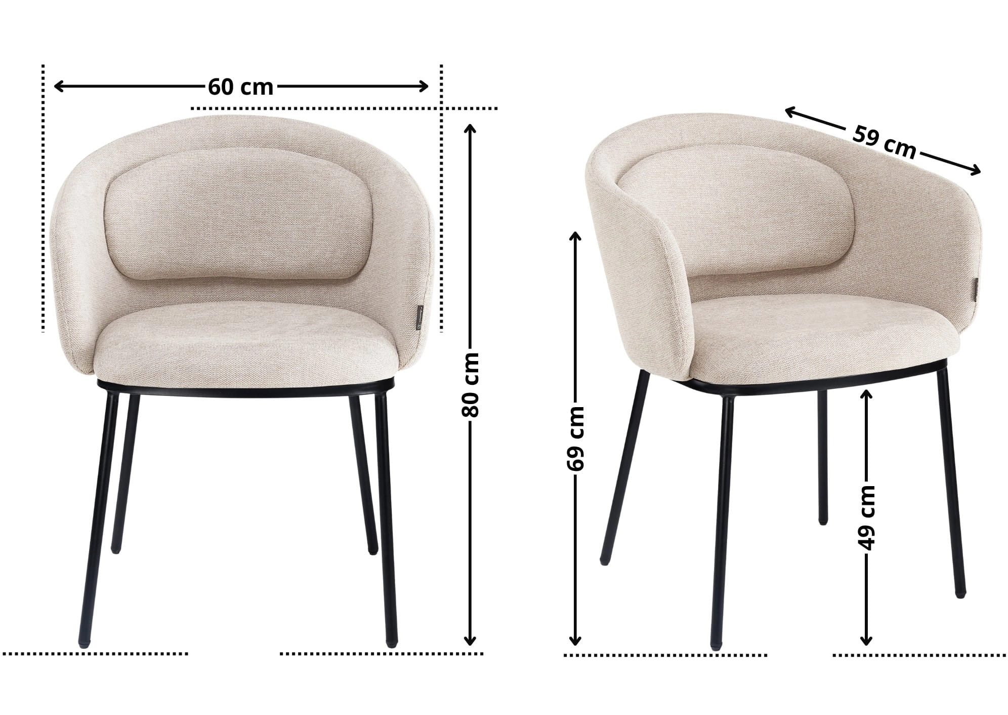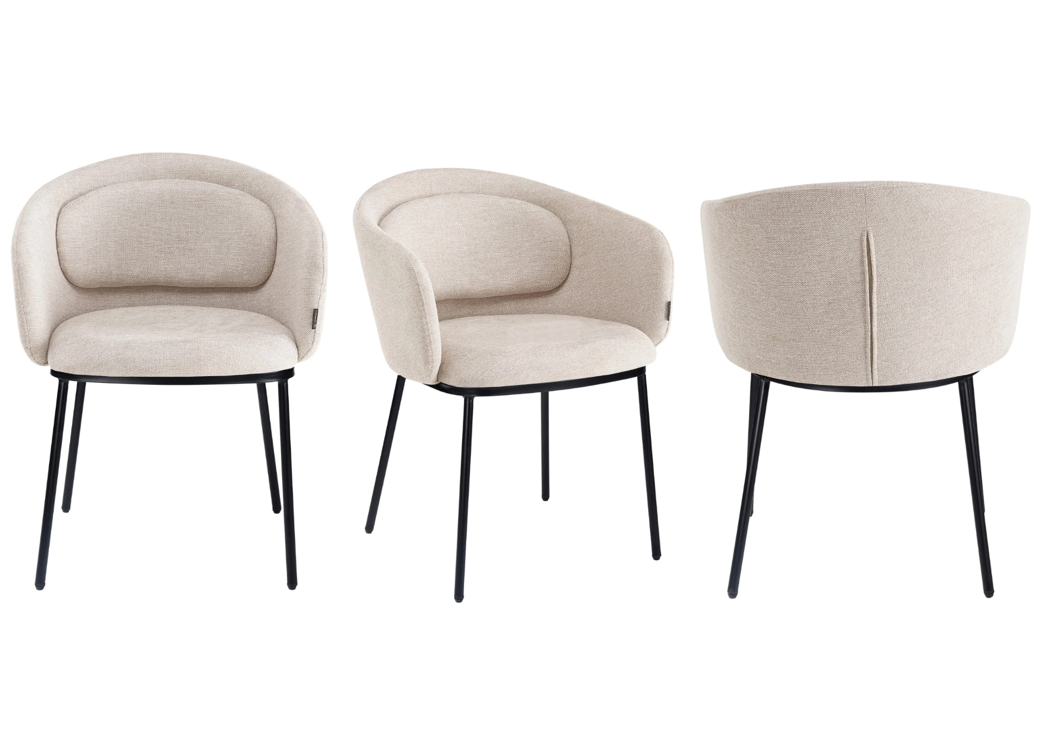 Zaokrąglona forma z podłokietnikami tworzy efekt lekkiego, otulającego fotelika, a kompaktowe wymiary sprawiają, że model nie przytłacza wnętrza. To krzesło beżowe na czarnych nogach pasuje zarówno do jasnych, naturalnych aranżacji, jak i do bardziej kontrastowych przestrzeni z czarnymi dodatkami.