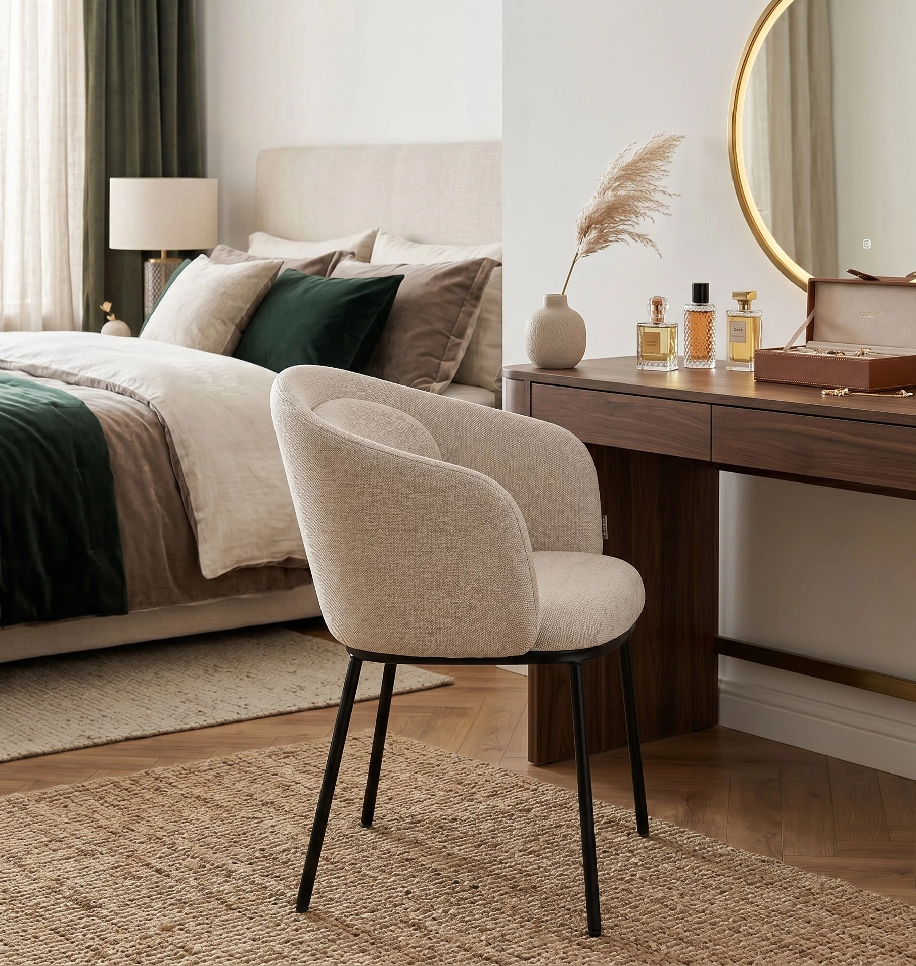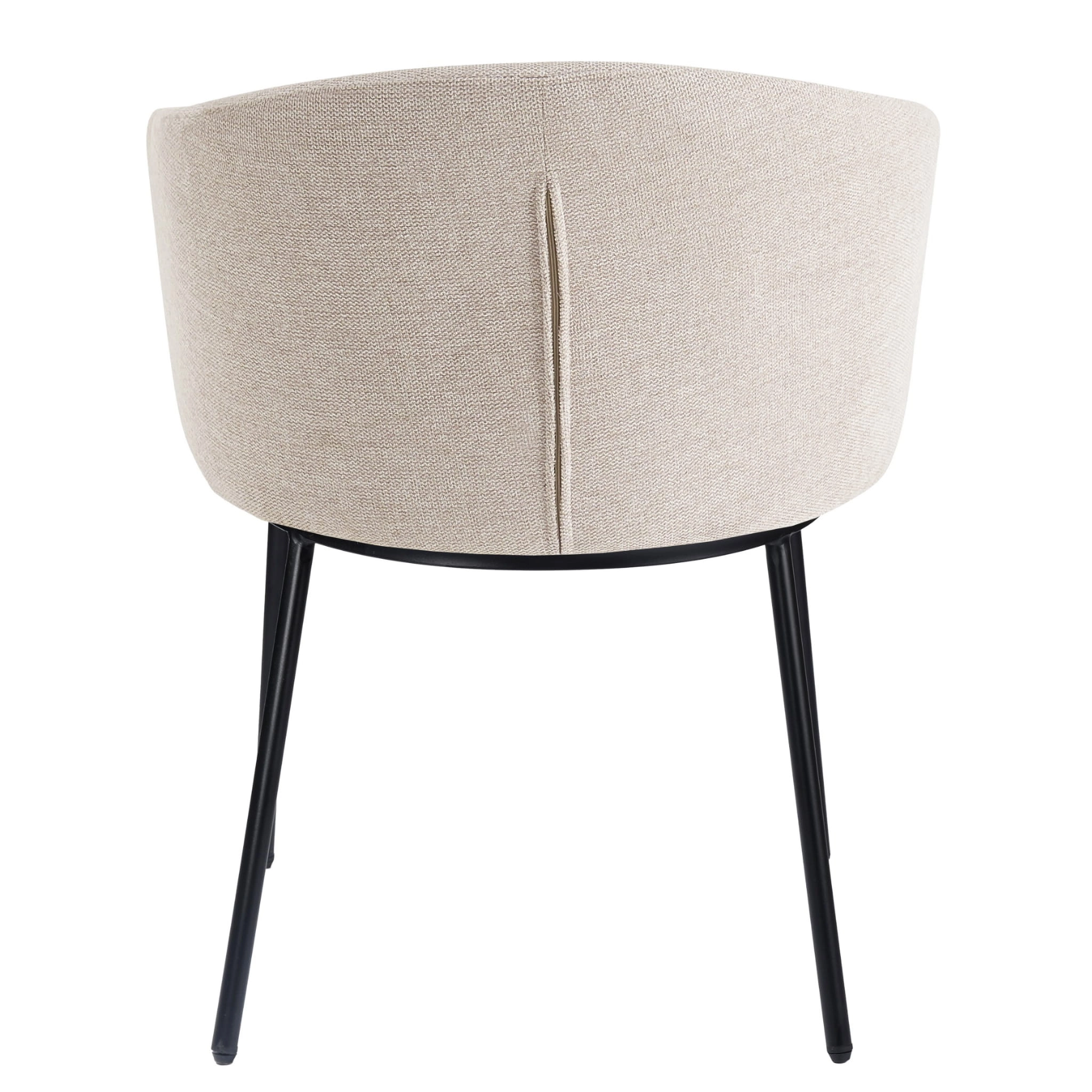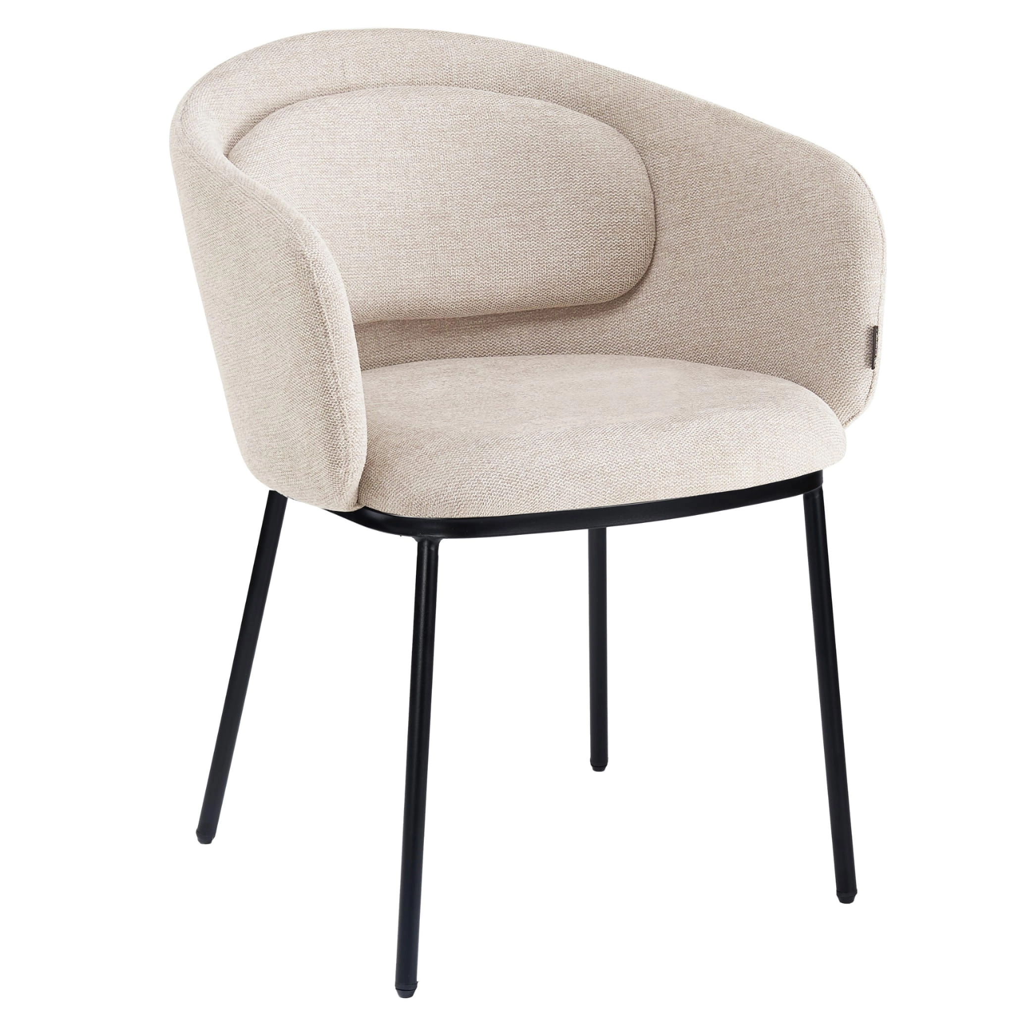Zaokrąglona forma z podłokietnikami tworzy efekt lekkiego, otulającego fotelika, a kompaktowe wymiary sprawiają, że model nie przytłacza wnętrza. To krzesło beżowe na czarnych nogach pasuje zarówno do jasnych, naturalnych aranżacji, jak i do bardziej kontrastowych przestrzeni z czarnymi dodatkami.