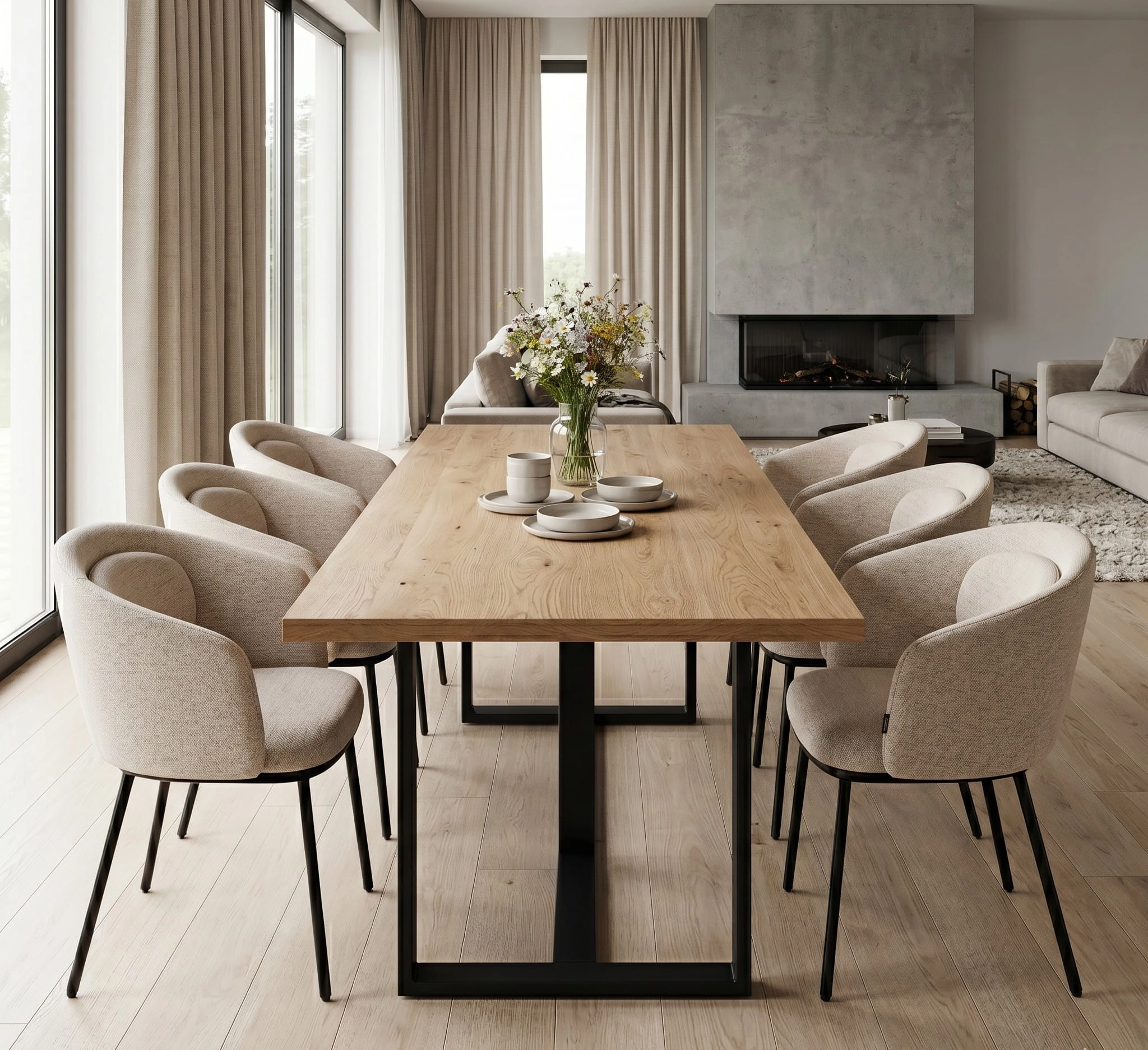- Czarne metalowe nogi – dodają lekkości wizualnej i dobrze współgrają z nowoczesnymi stołami, loftowymi dodatkami oraz minimalistycznym oświetleniem.