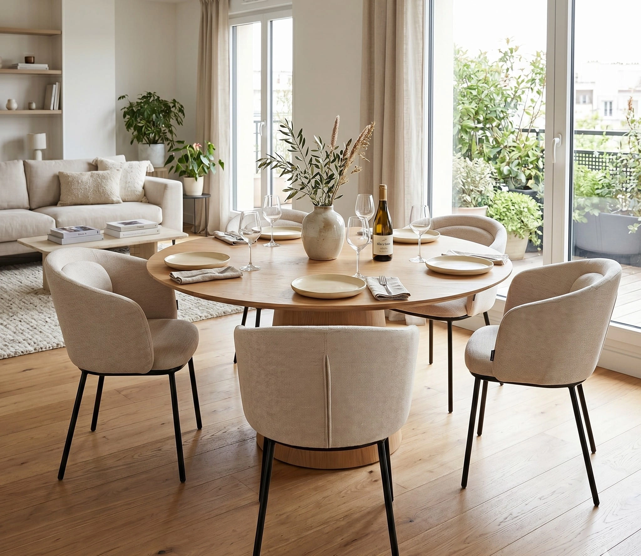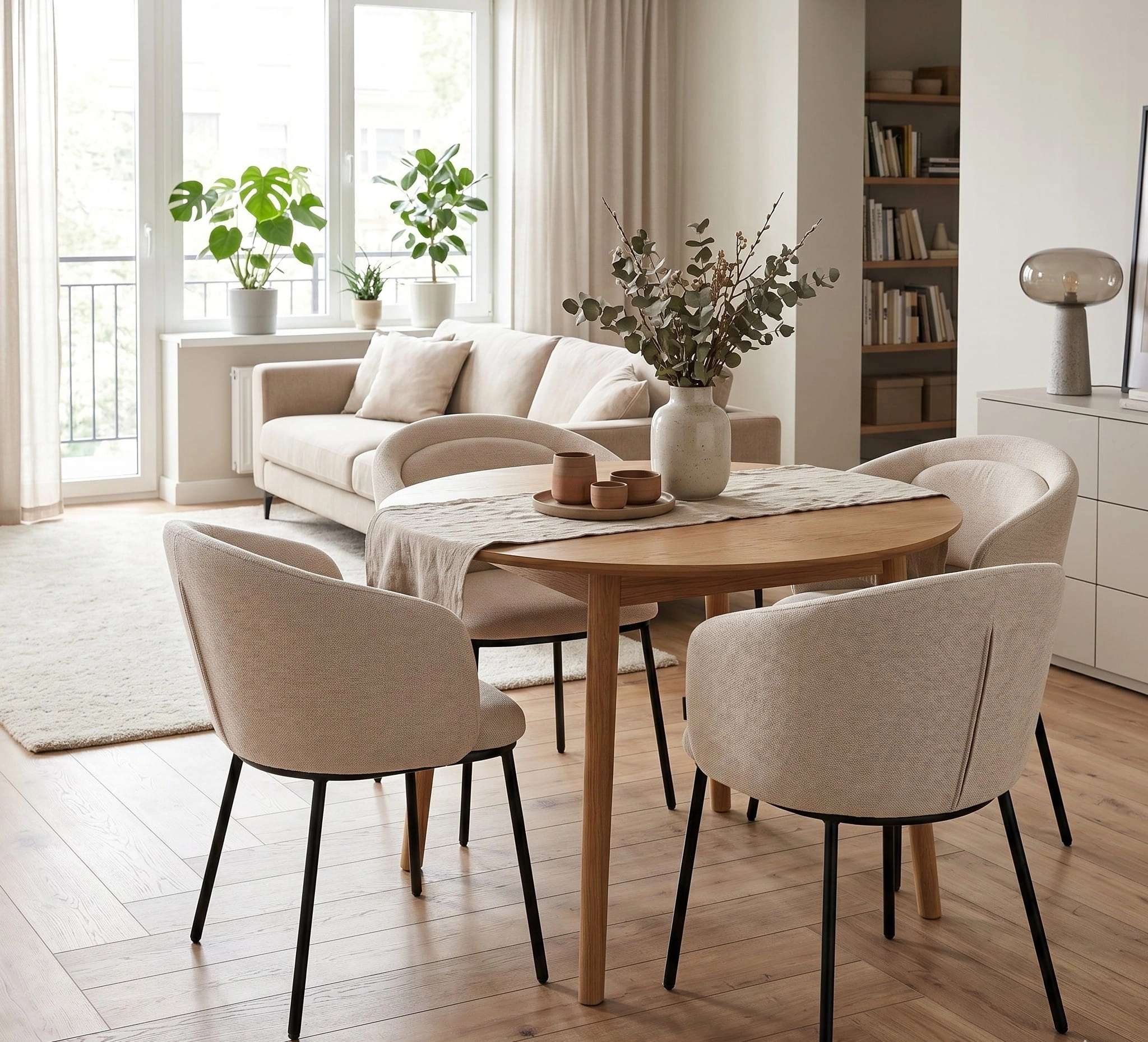 BLUMO rozwiązuje ten problem miękką, zaokrągloną formą. To krzesło z podłokietnikami, które wizualnie przypomina niewielki fotelik, dlatego przy stole wygląda bardziej elegancko i zapraszająco. Beżowa tapicerka ociepla wnętrze, a czarne nogi dodają kontrastu, dzięki czemu model dobrze odnajduje się zarówno w aranżacji japandi, jak i w nowoczesnej jadalni z loftowymi akcentami.