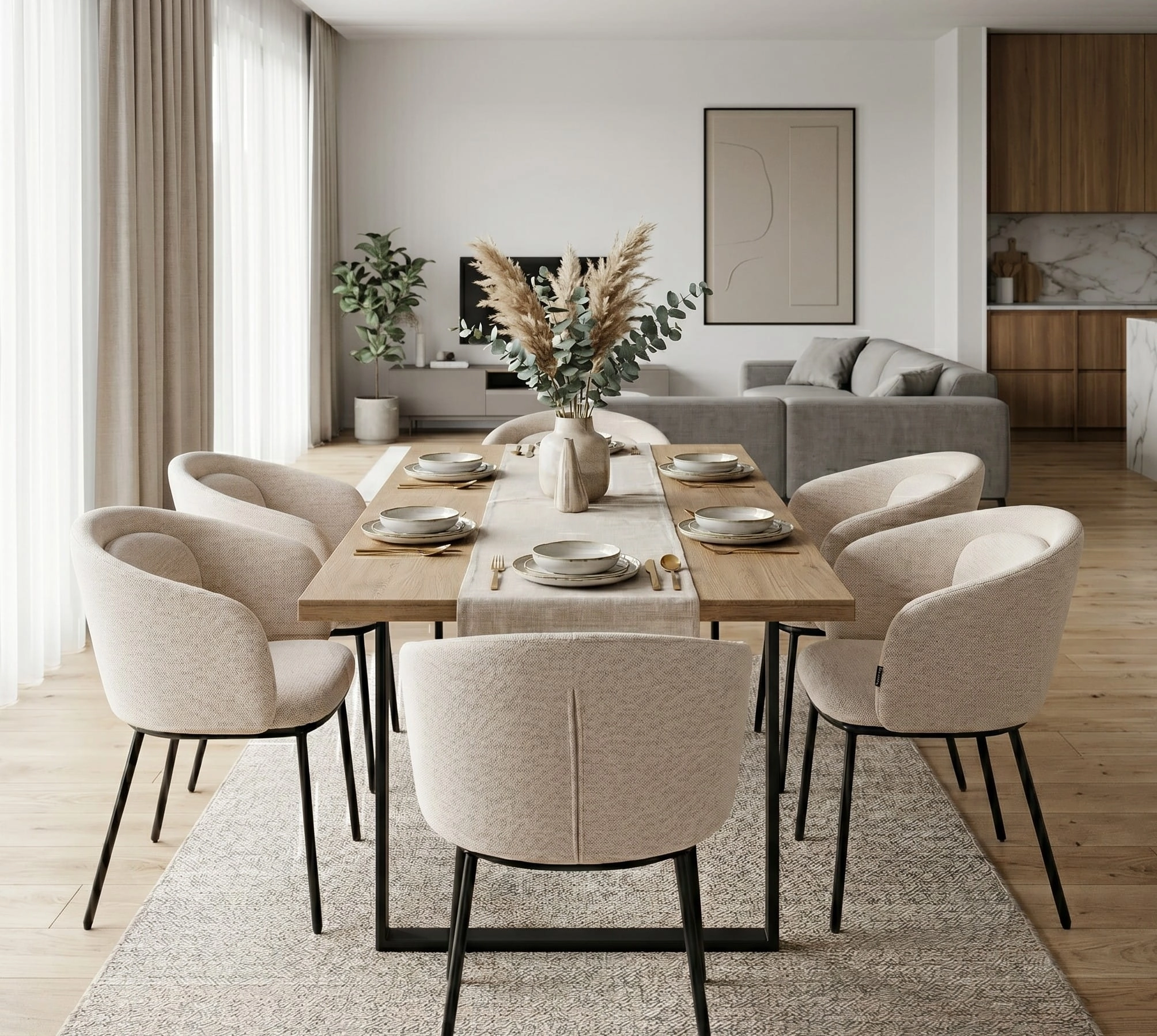 Model świetnie współgra z okrągłymi i prostokątnymi stołami, blatami w kolorze dębu, kaszmiru, czerni, bieli, marmuru oraz trawertynu. Możesz zestawić go także z lampą wiszącą nad stołem, czarnymi dodatkami, jasnym dywanem lub minimalistyczną komodą, aby stworzyć spójną i przyjemną przestrzeń do życia.