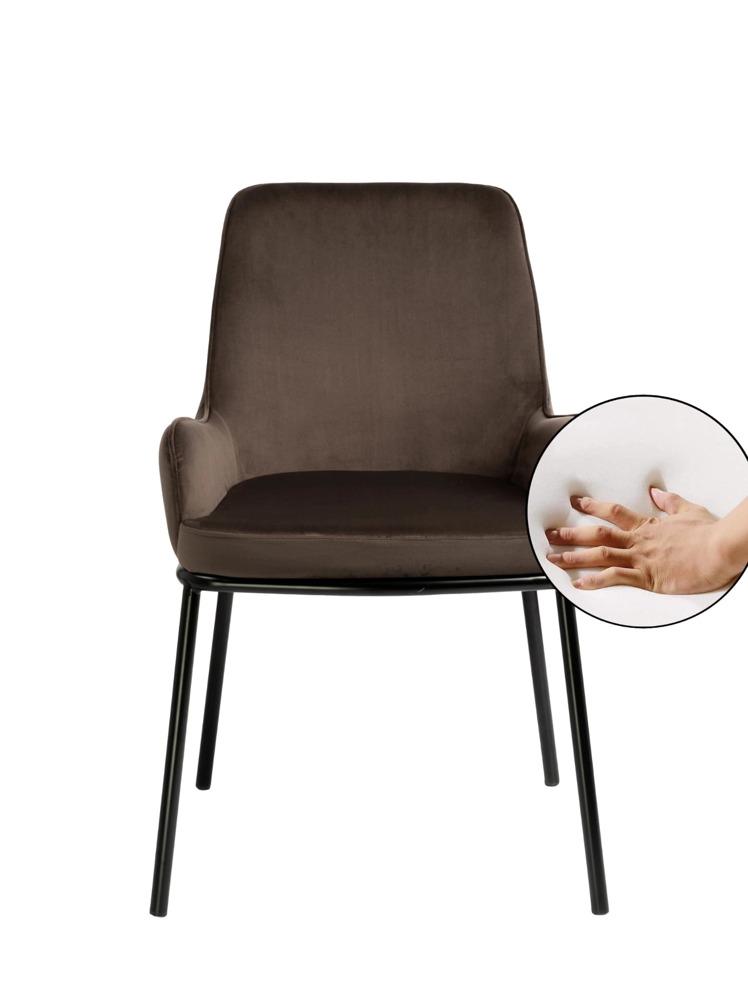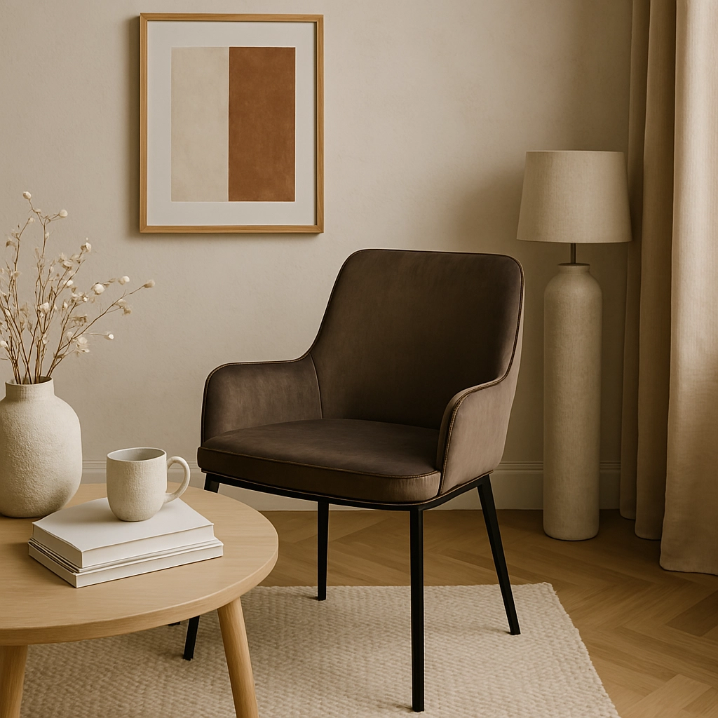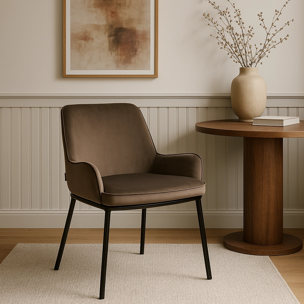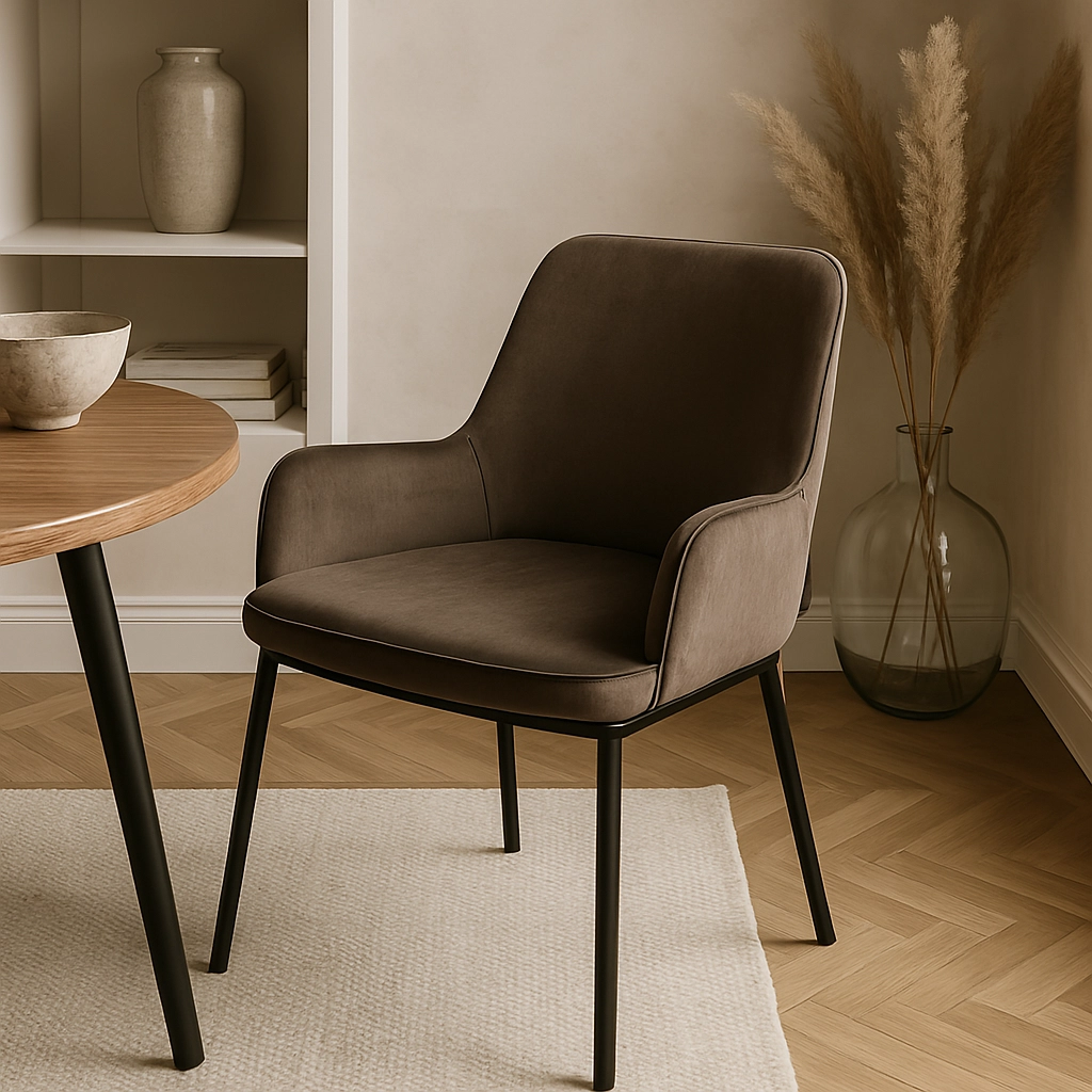 Krzesło tapicerowane SANTO velvet brązowy to propozycja dla osób, które cenią miękkość weluru i estetykę dopracowanej formy. Brązowy odcień tkaniny wprowadza do wnętrza spokój i ciepło, a czarny stelaż podkreśla nowoczesny charakter aranżacji. SANTO świetnie prezentuje się przy stołach z blatem drewnianym, kamiennym lub ceramicznym, tworząc spójny, elegancki zestaw w jadalni i salonie.