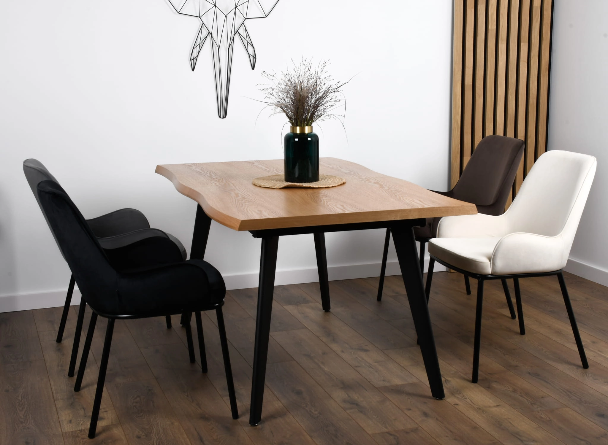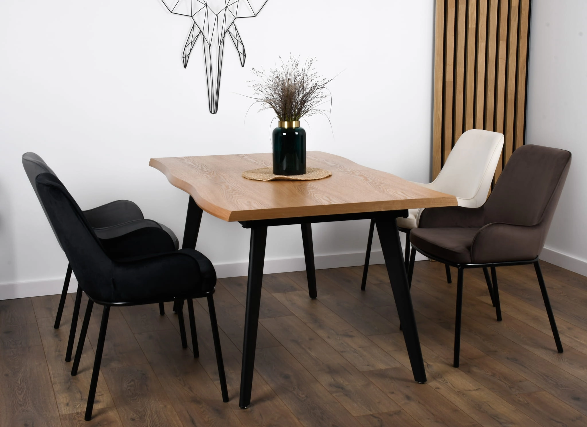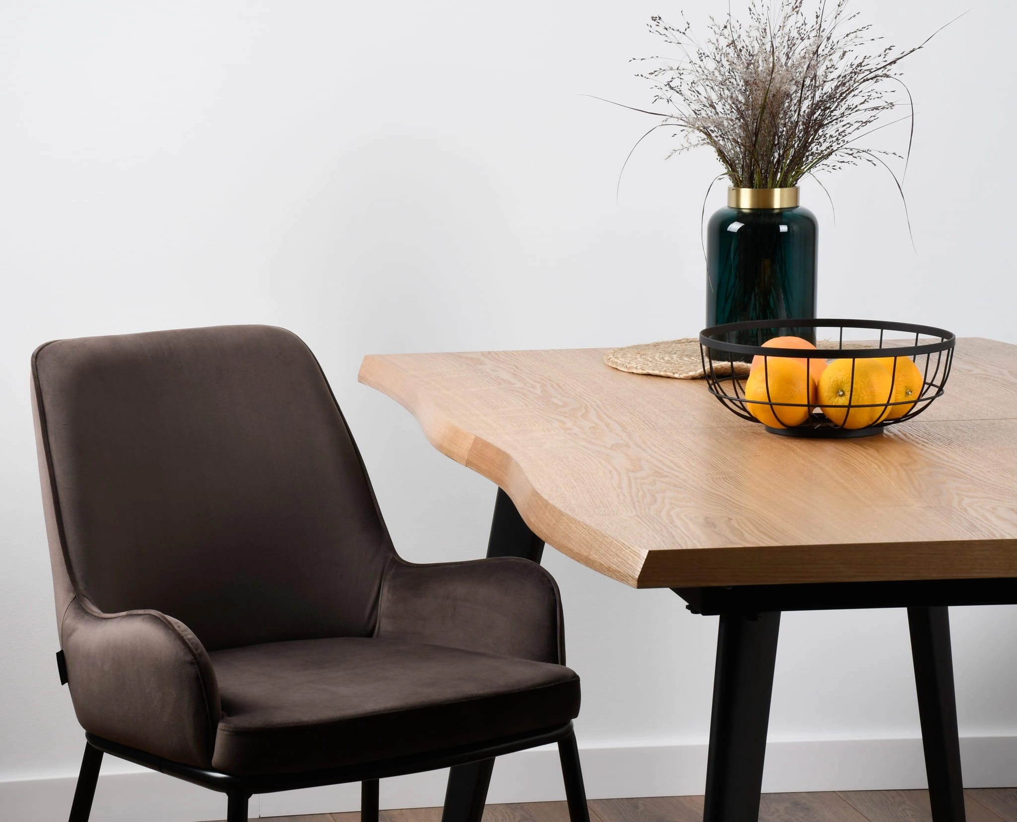 Dzięki ergonomicznie dobranym wymiarom i wygodnemu siedzisku krzesło sprawdza się zarówno podczas dłuższych spotkań przy stole, jak i na co dzień. Welur subtelnie pracuje ze światłem, dodając wnętrzu wrażenia przytulności i premium. To uniwersalny wybór do przestrzeni nowoczesnych, skandynawskich i minimalistycznych, a także do aranżacji z elementami loft.