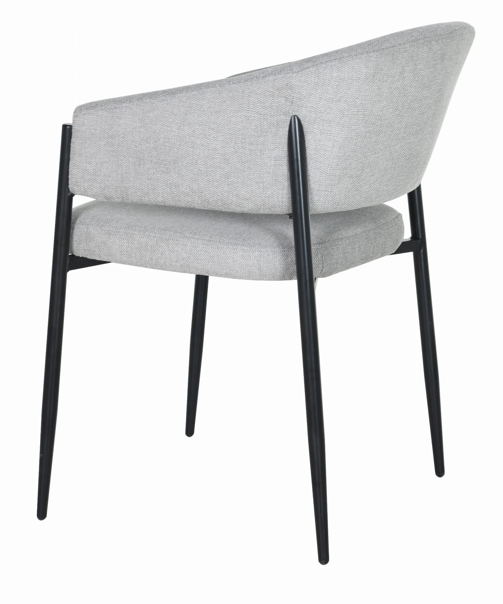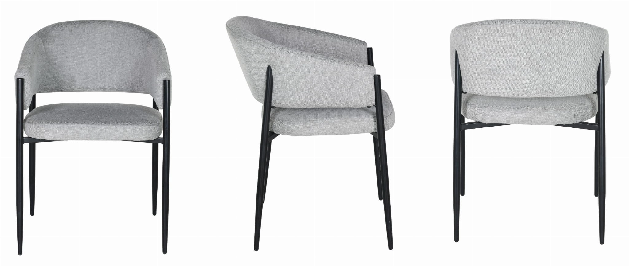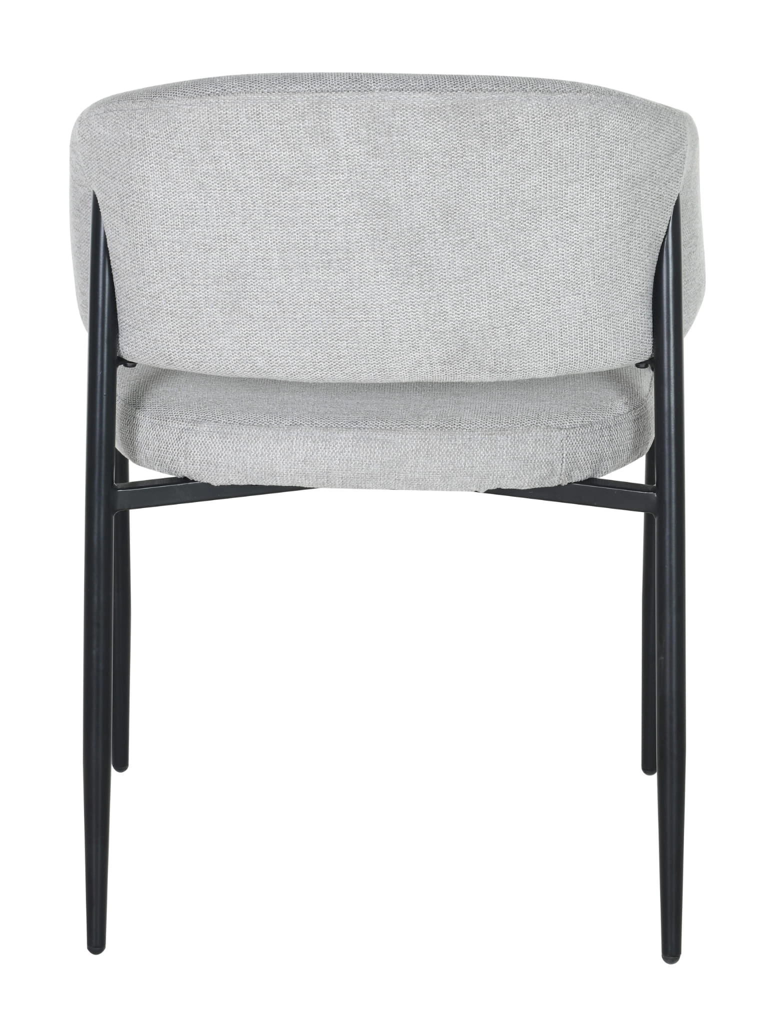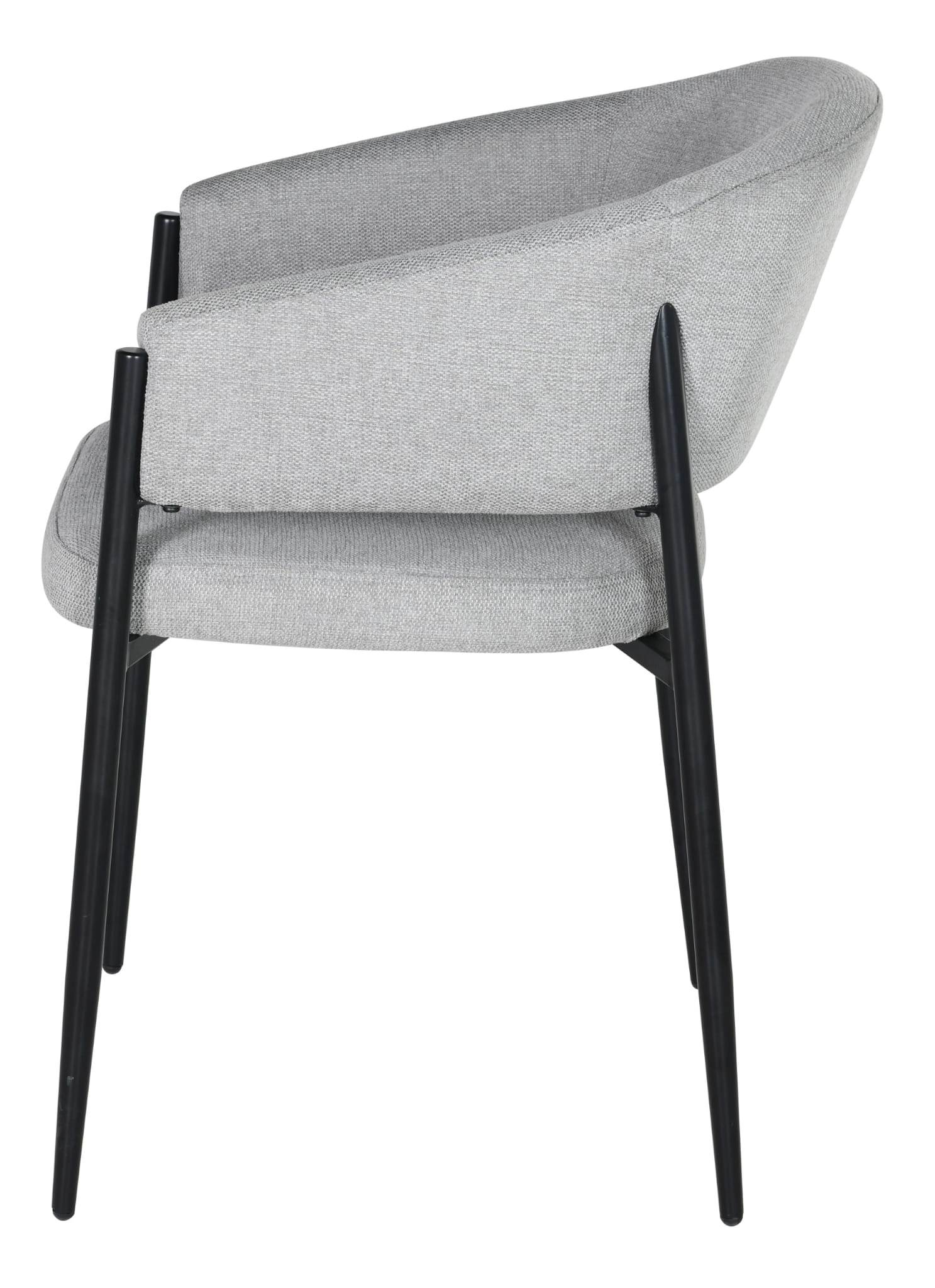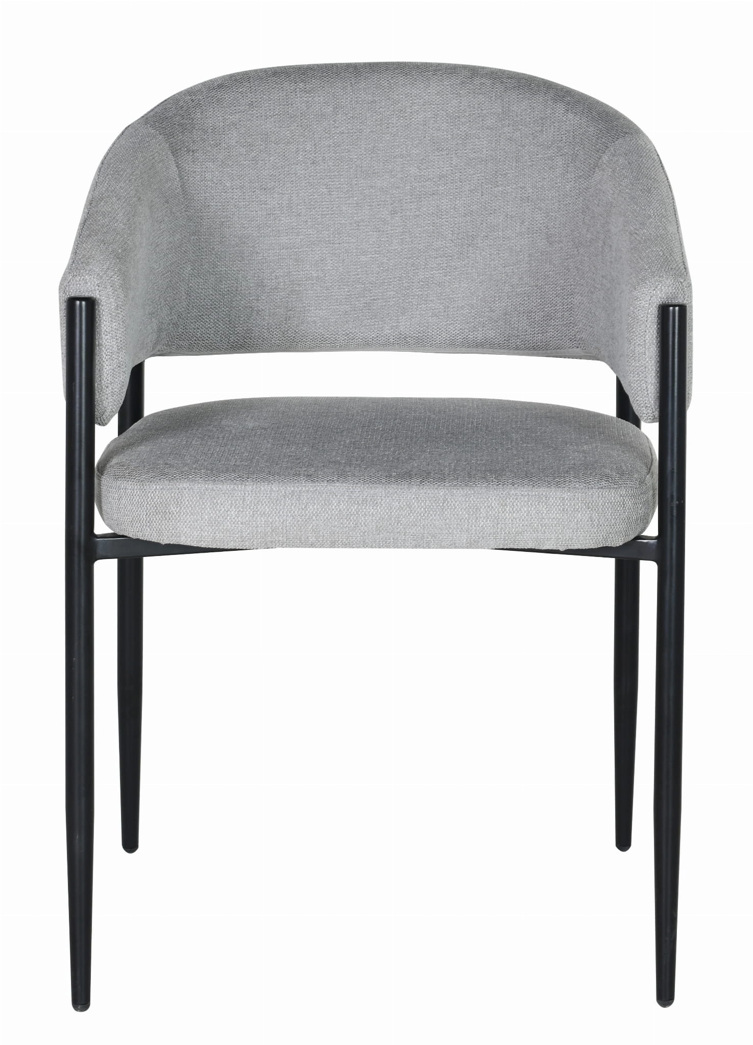 Tapicerowane przyjemną w dotyku tkaniną w ponadczasowym szarym odcieniu, krzesło świetnie prezentuje się zarówno w przestrzeniach nowoczesnych, jak i bardziej klasycznych. Czarne, metalowe nogi podkreślają jego uniwersalny charakter, a także zapewniają trwałość i stabilność.
