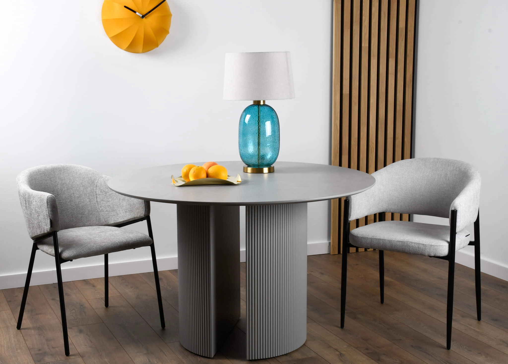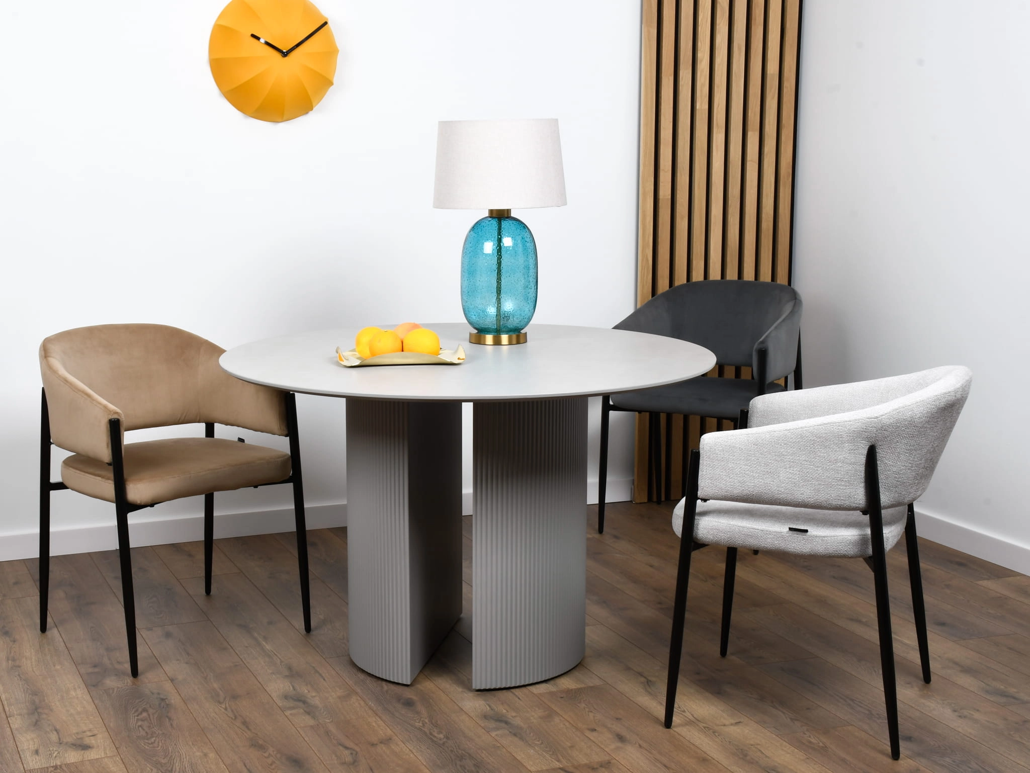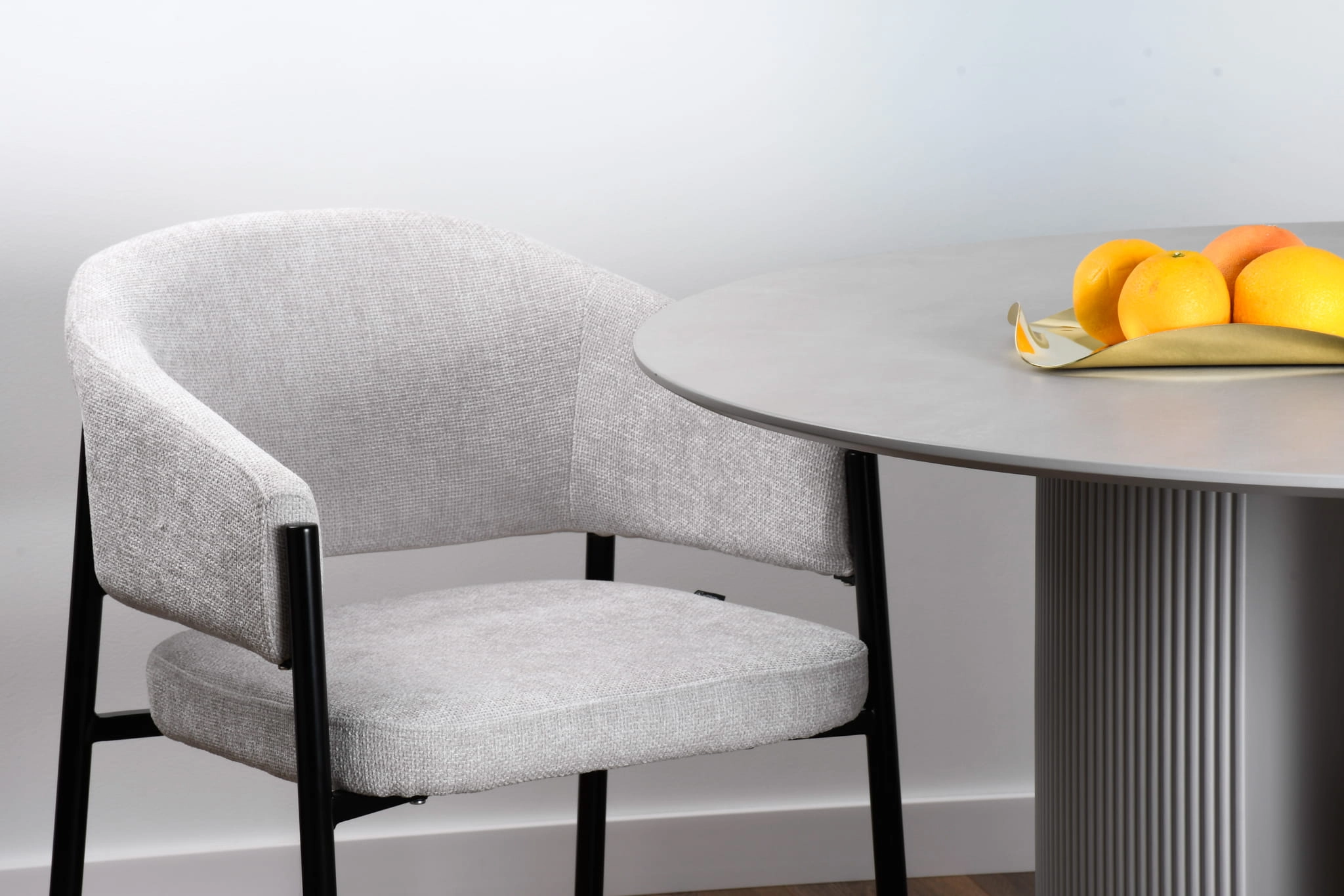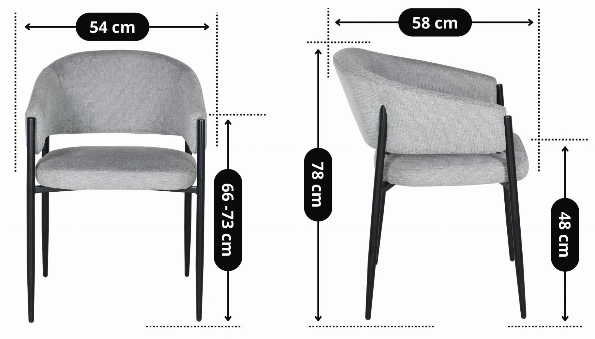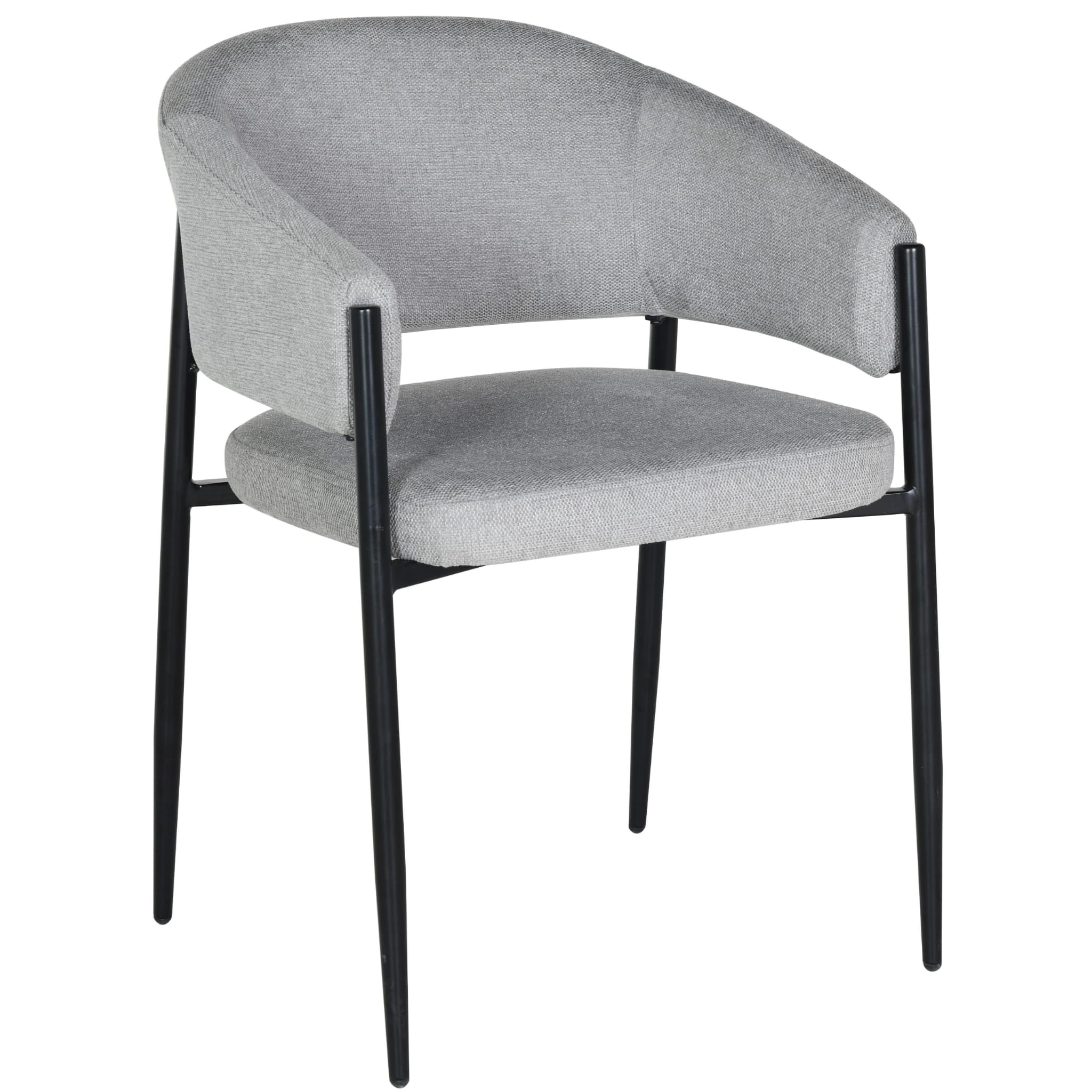 Tapicerowane przyjemną w dotyku tkaniną w ponadczasowym szarym odcieniu, krzesło świetnie prezentuje się zarówno w przestrzeniach nowoczesnych, jak i bardziej klasycznych. Czarne, metalowe nogi podkreślają jego uniwersalny charakter, a także zapewniają trwałość i stabilność.