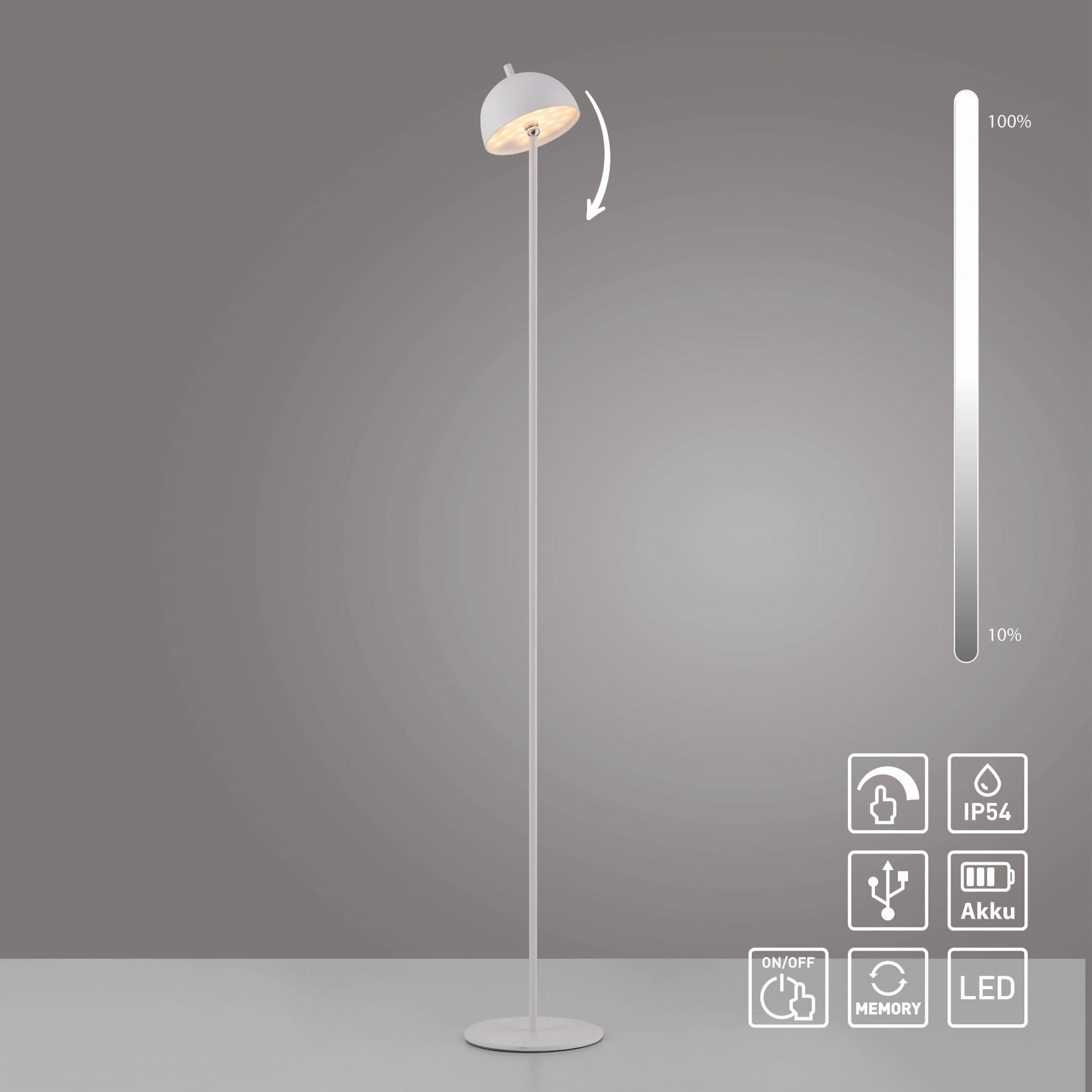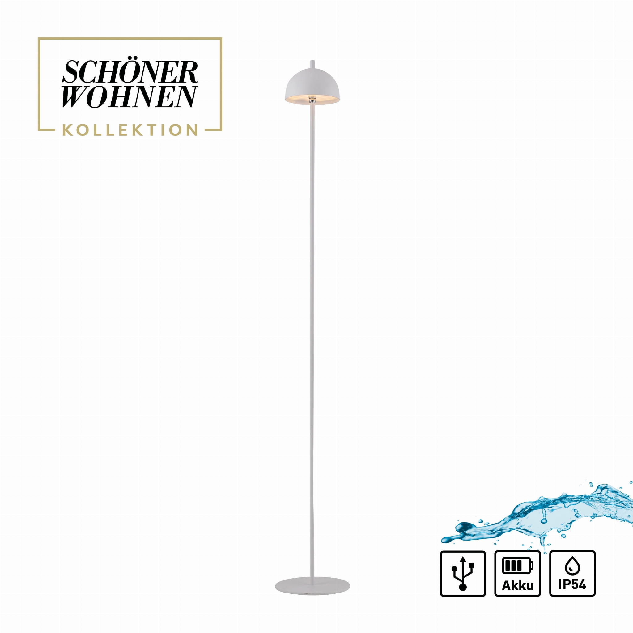 - Klasa szczelności IP54 – zyskujesz spokój o trwałość urządzenia, gdyż konstrukcja jest odporna na wilgoć i zachlapania, idealnie sprawdzając się jako mobilna lampa tarasowa.