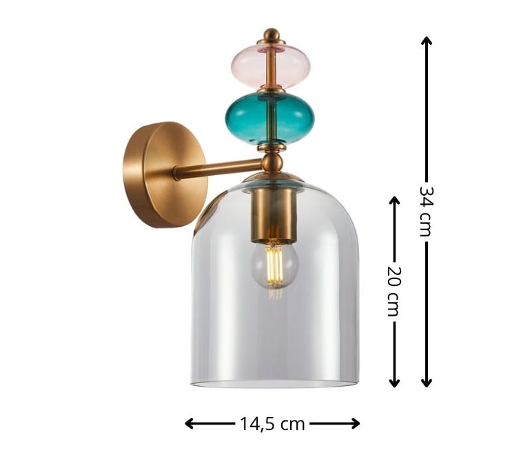 Kinkiet BUSCO to znakomita propozycja dla osób ceniących eleganckie i dekoracyjne oświetlenie ścienne. Stylowy złoty stelaż i kolorowy klosz ze szkła nadają mu wyrafinowanego charakteru, dzięki któremu wnętrze zyskuje indywidualny i luksusowy sznyt. Lampa doskonale pasuje do takich aranżacji jak nowoczesne wnętrza glamour, sypialnie z toaletką czy salony z designerskim akcentem.