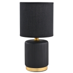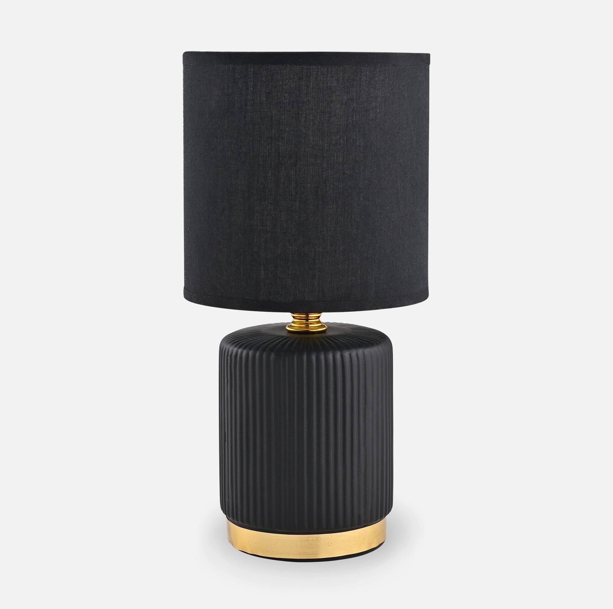 Wyobraź sobie wieczór, w którym miękkie światło delikatnie otula wnętrze, tworząc atmosferę relaksu i spokoju. Ta lampa stołowa do sypialni została zaprojektowana tak, aby łączyć funkcjonalność z ponadczasową estetyką. Ryflowana ceramiczna podstawa w głębokiej czerni oraz złote wykończenie dodają wnętrzu subtelnego prestiżu.