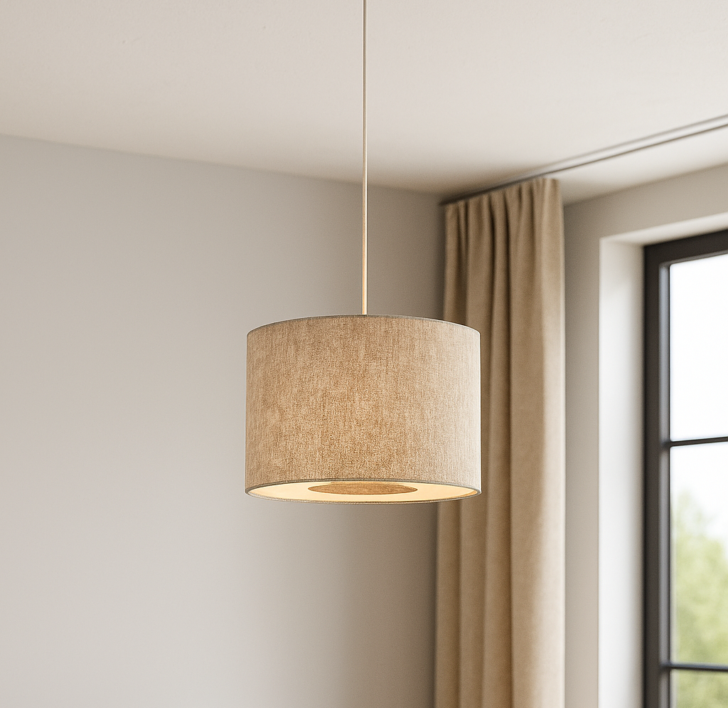 ✨ Nowoczesna lampa wisząca CEDRO S – tkaninowy abażur w beżowym odcieniu