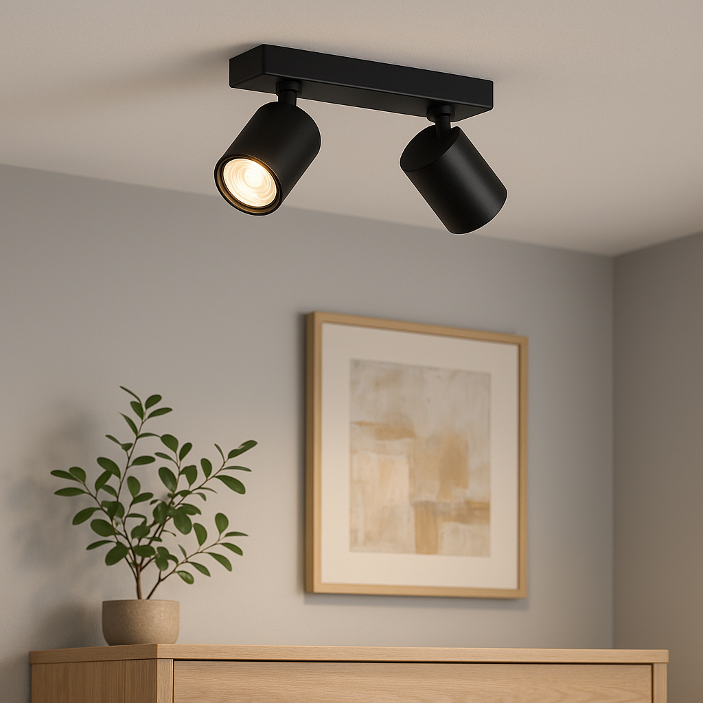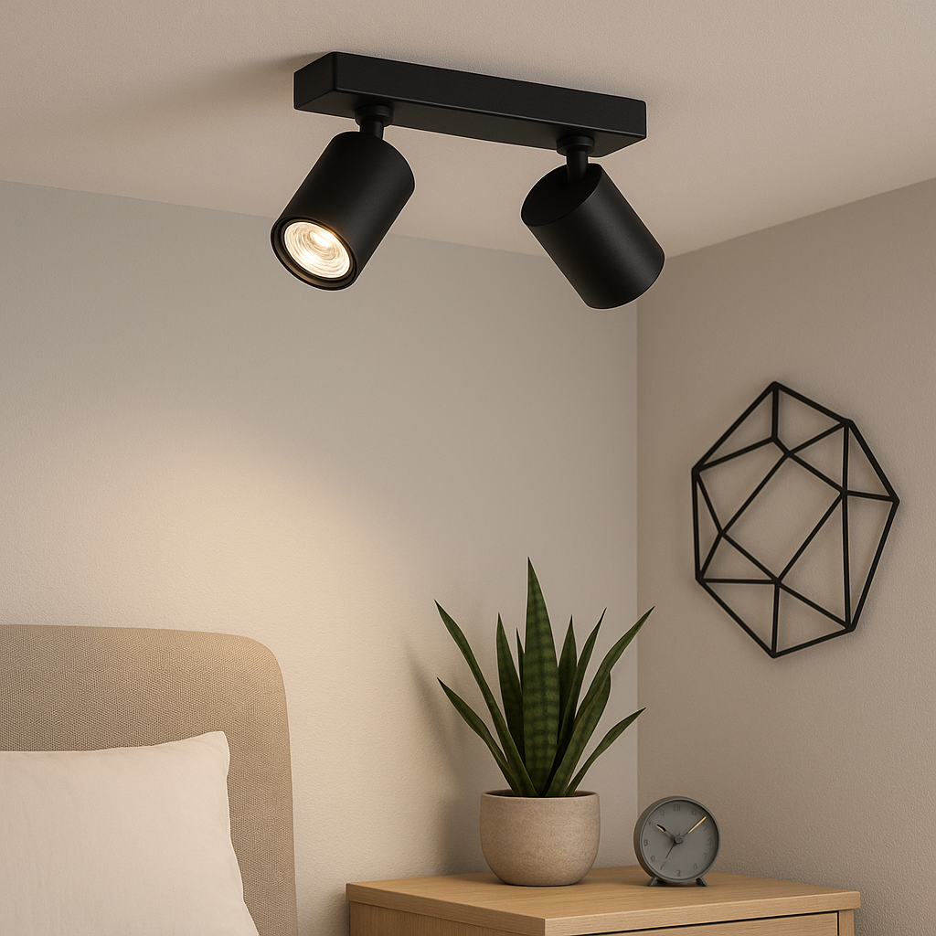 Lampa sufitowa LUMSI 2 czarna to funkcjonalne i designerskie rozwiązanie, które wprowadzi do Twojego wnętrza wyjątkowy klimat. Wykonana z trwałego metalu, w modnym kolorze piaskowanej czerni, świetnie pasuje do wnętrz w stylu nowoczesnym i loftowym. Dzięki możliwości zastosowania źródeł światła GU10 — zarówno LED, jak i tradycyjnych — zapewnia elastyczne dopasowanie do Twoich potrzeb. To doskonały wybór dla każdego, kto szuka lampy sufitowej nowoczesnej GU10, łączącej minimalistyczny design i funkcjonalność.