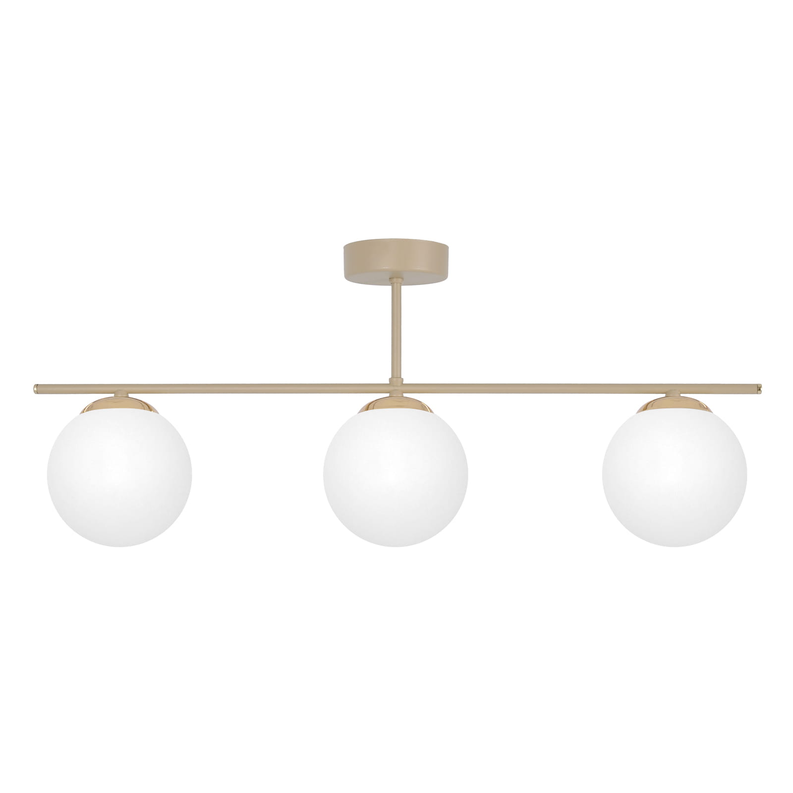 Lampa sufitowa SAVIA beżowa to idealny wybór dla osób, które chcą nadać wnętrzu wyjątkowego charakteru. Jej 3 szklane klosze o średnicy 14 cm zapewniają odpowiednie i równomierne oświetlenie, a subtelne połączenie kolorów beżu, bieli i złota wprowadza do pomieszczenia elegancję i ciepło.