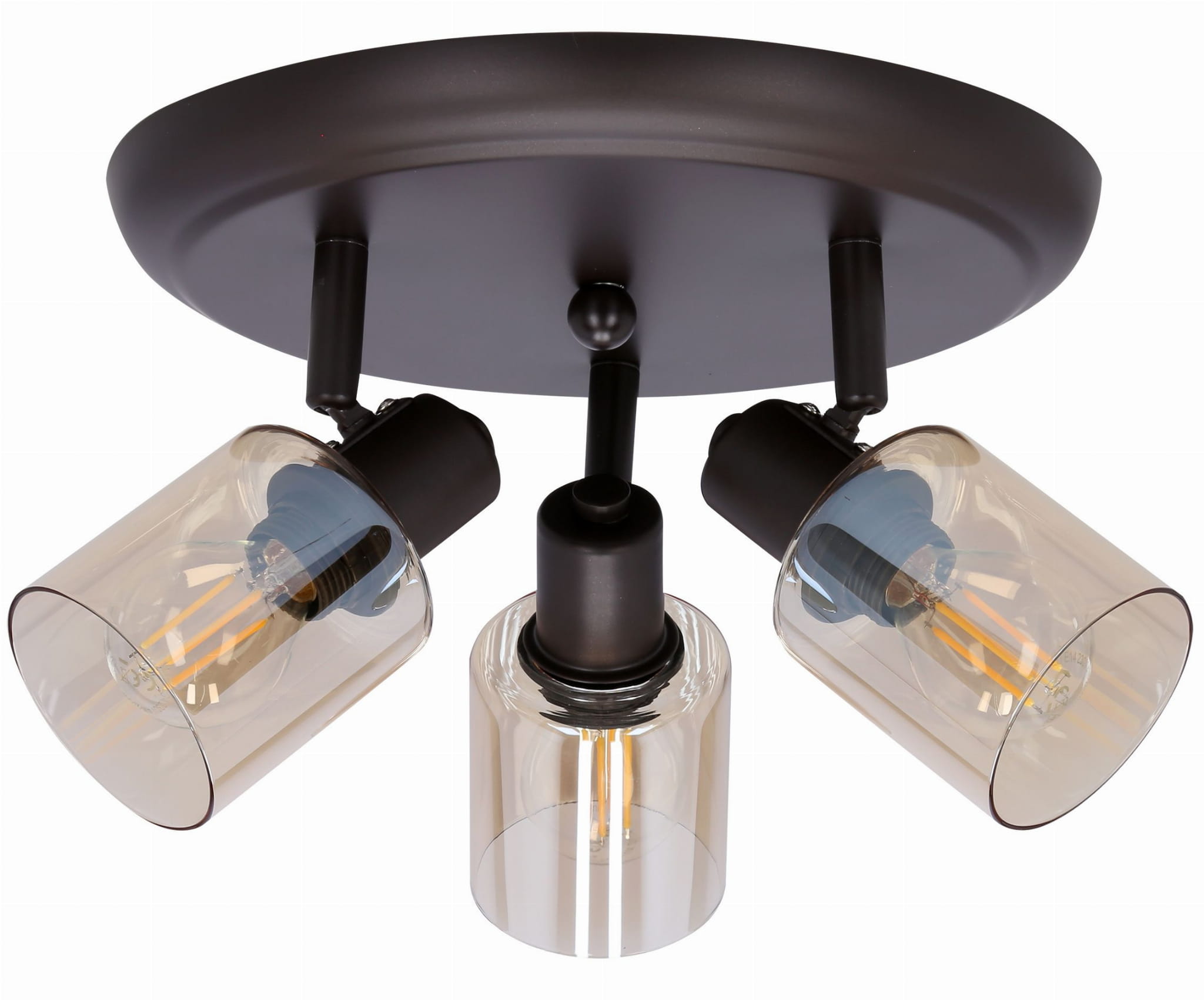 Lampa sufitowa AGRA to plafon, który łączy klasyczne wzornictwo z ciepłym, nastrojowym światłem. Trzy bursztynowe klosze umieszczone na stalowej, brunatnej podstawie tworzą efekt przytulnego, równomiernego oświetlenia – idealnego do korytarza, kuchni czy łazienki.