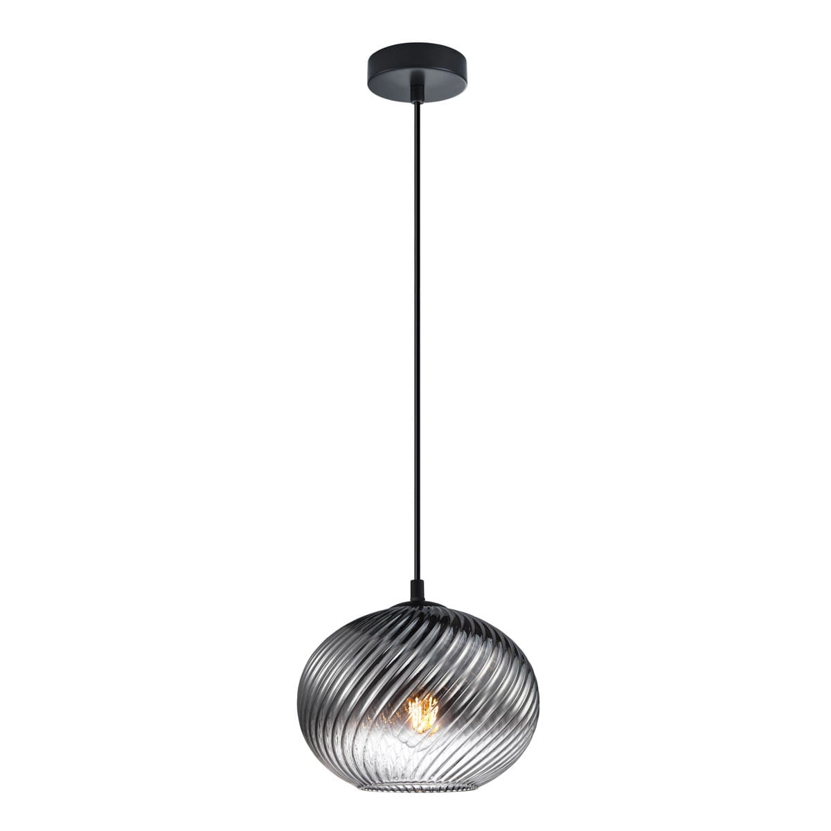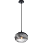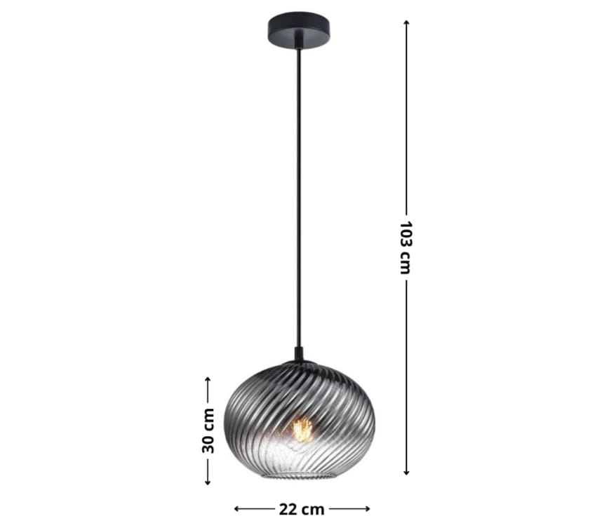 ALIAS to lampa wisząca szklana, która łączy dymiony klosz, czarne detale i dekoracyjne ryflowanie szkła. Dzięki temu dobrze sprawdzi się jako nowoczesna lampa do salonu, oświetlenie nad stół w jadalni albo pojedynczy punkt światła nad blatem kuchennym.