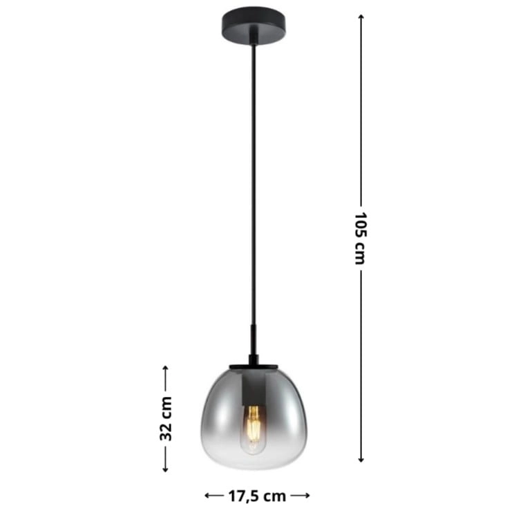 ANTITA to lampa wisząca szklana, która łączy prostą formę, czarną oprawę i dymiony klosz. Dzięki temu dobrze sprawdzi się jako nowoczesna lampa do salonu, oświetlenie nad stół w jadalni albo pojedynczy punkt światła nad wyspę kuchenną. Szklany klosz delikatnie eksponuje żarówkę, dlatego model dobrze wygląda z dekoracyjnym źródłem światła E27.