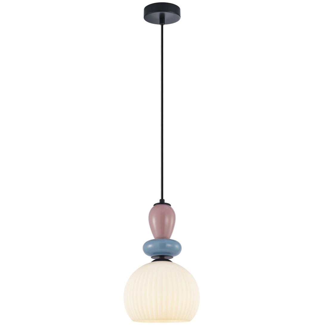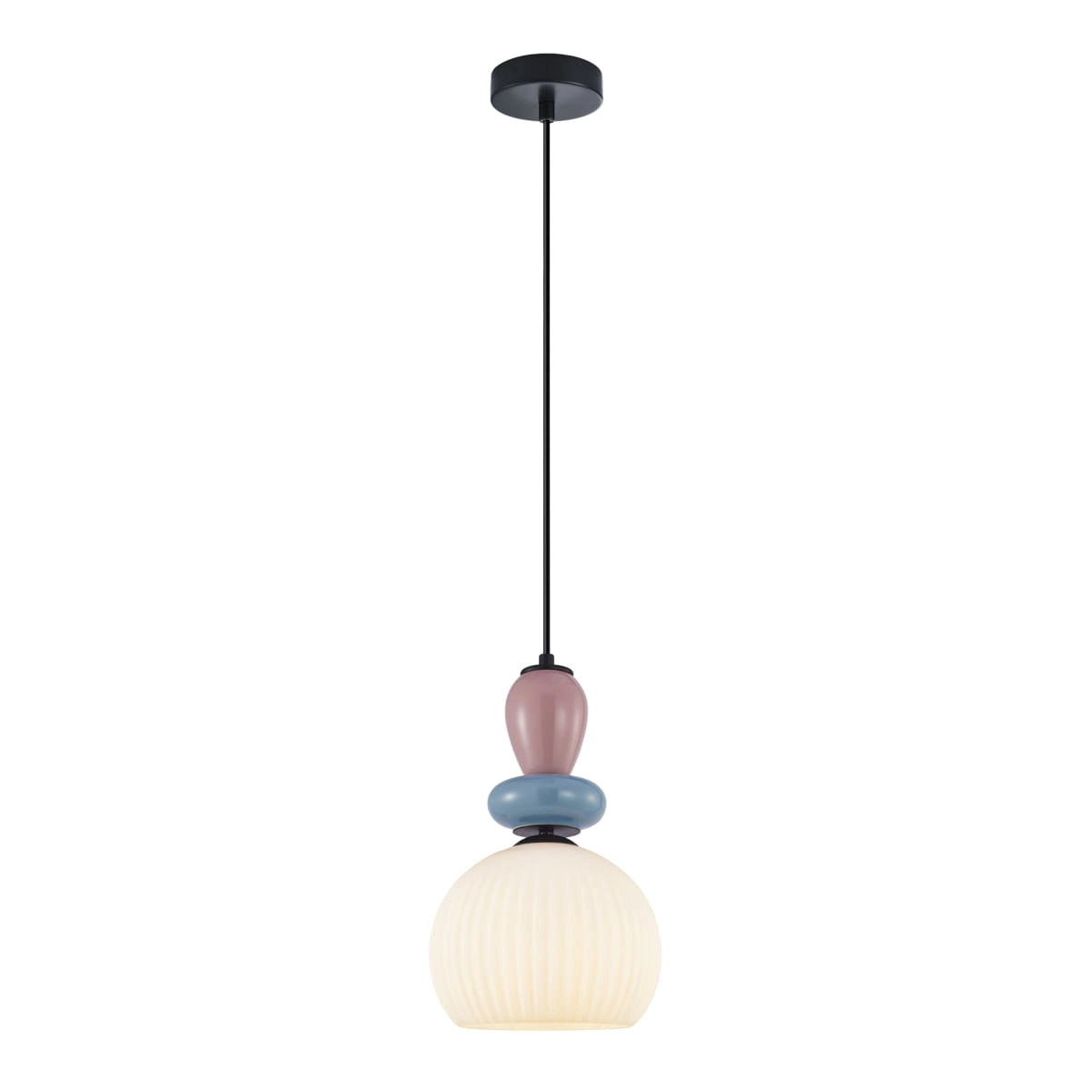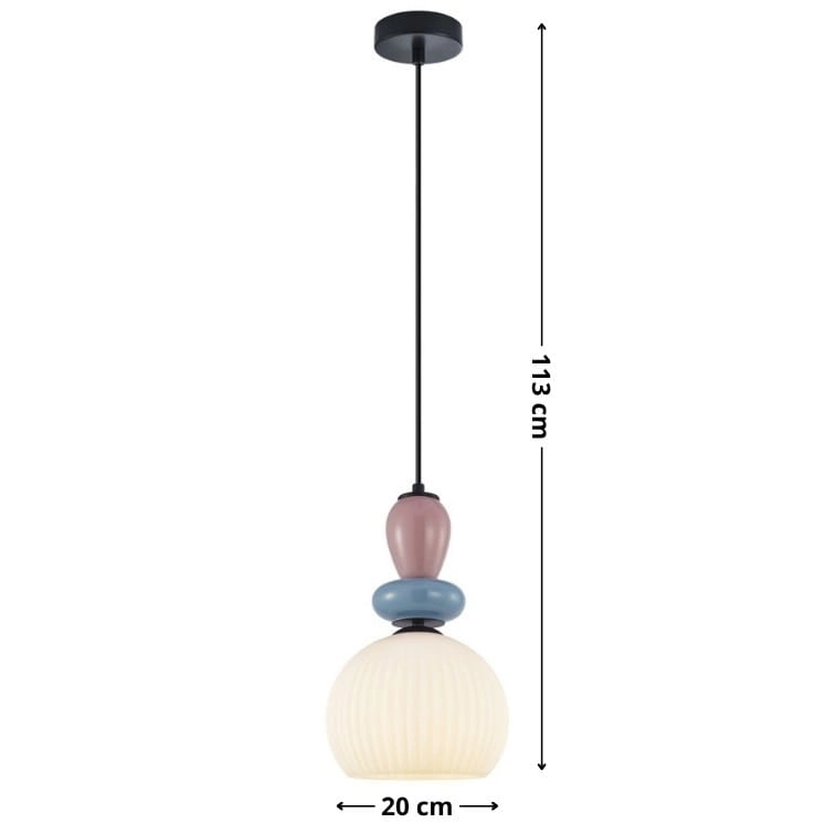 DOMALI to lampa wisząca nowoczesna, która łączy prostą czarną konstrukcję z dekoracyjnymi elementami w odcieniach niebieskiego i różowego. Biały, szklany klosz pomaga stworzyć miękkie światło do wnętrza, dlatego model dobrze odnajdzie się nad stołem, w sypialni, pokoju dziecięcym lub jako dekoracyjne oświetlenie w holu.