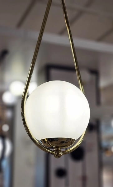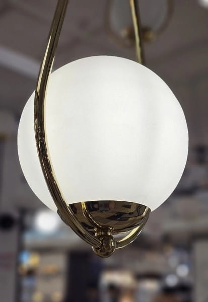 - Nowoczesny i elegancki design – złota rama i biały szklany klosz