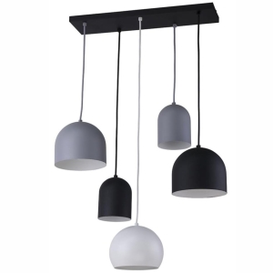 Lampa wisząca TEMPRE 5 czarna to efektowna lampa sufitowa 5-punktowa, która pięknie doświetla przestrzeń nad stołem, wyspą kuchenną lub w strefie wypoczynkowej. Połączenie czarnego stelaża z kloszami w odcieniach czerni, szarości i bieli tworzy stylową kompozycję, idealną do nowoczesnych aranżacji. Pięć oprawek E27 LED zapewnia mocne, równomierne oświetlenie większych pomieszczeń.