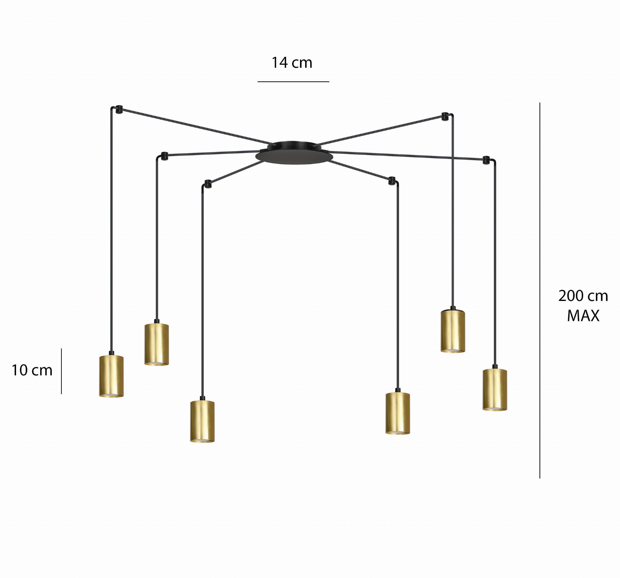 Dzięki regulowanym przewodom (każdy o długości 2 m), możesz dopasować wysokość zwisów do swoich potrzeb i stworzyć unikalną kompozycję świetlną. Sześć punktów świetlnych GU10 zapewnia mocne i równomierne światło, które doskonale sprawdzi się w salonie, jadalni, kuchni czy biurze.