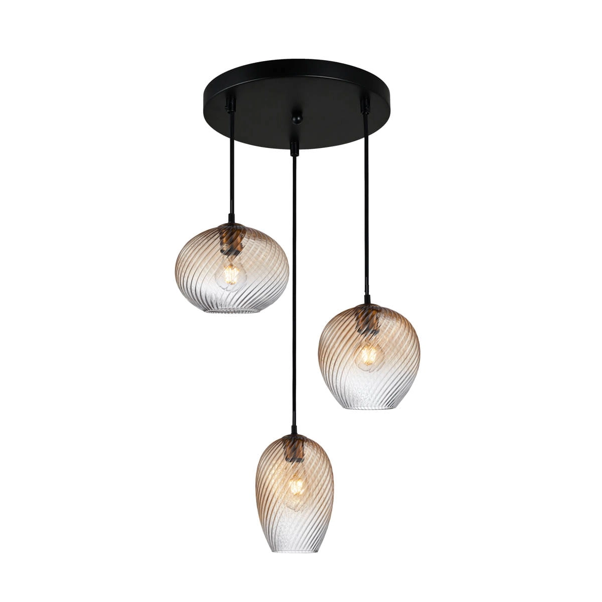 Lampa wisząca ALIAS to propozycja dla osób, które chcą połączyć funkcjonalne oświetlenie z dekoracyjnym efektem szkła. Trzy bursztynowe klosze tworzą przyjemny wizualnie rytm, dlatego model dobrze sprawdzi się jako lampa do jadalni nad stół, oświetlenie salonu lub lampa nad wyspę kuchenną.