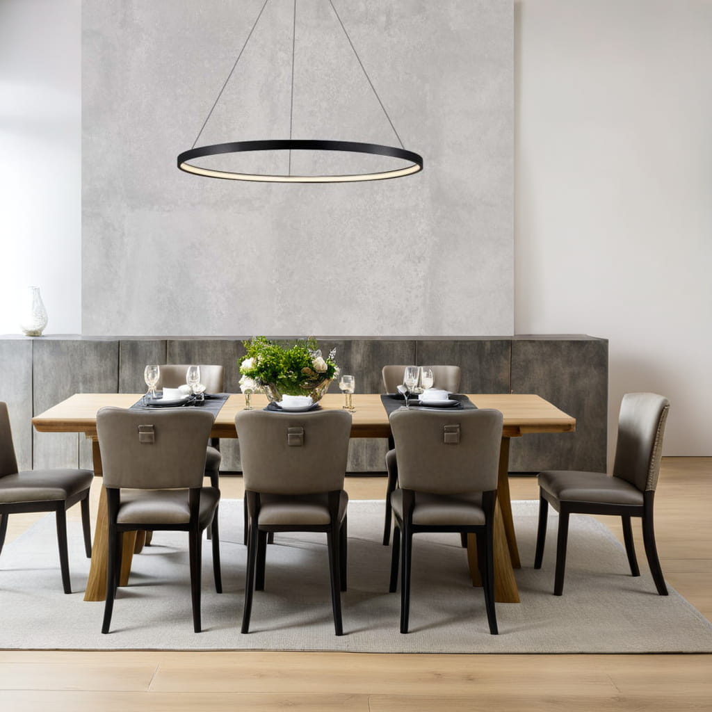 Lampa wisząca RING 40 cm czarna 4000K to połączenie nowoczesnego stylu z funkcjonalnością, dzięki czemu pasuje do wnętrz w stylu glamour, industrialnym lub klasycznym. Dzięki zintegrowanemu źródłu LED o mocy 24W i neutralnej barwie światła 4000K, lampa idealnie oświetli Twoje wnętrze, tworząc przyjemny klimat.