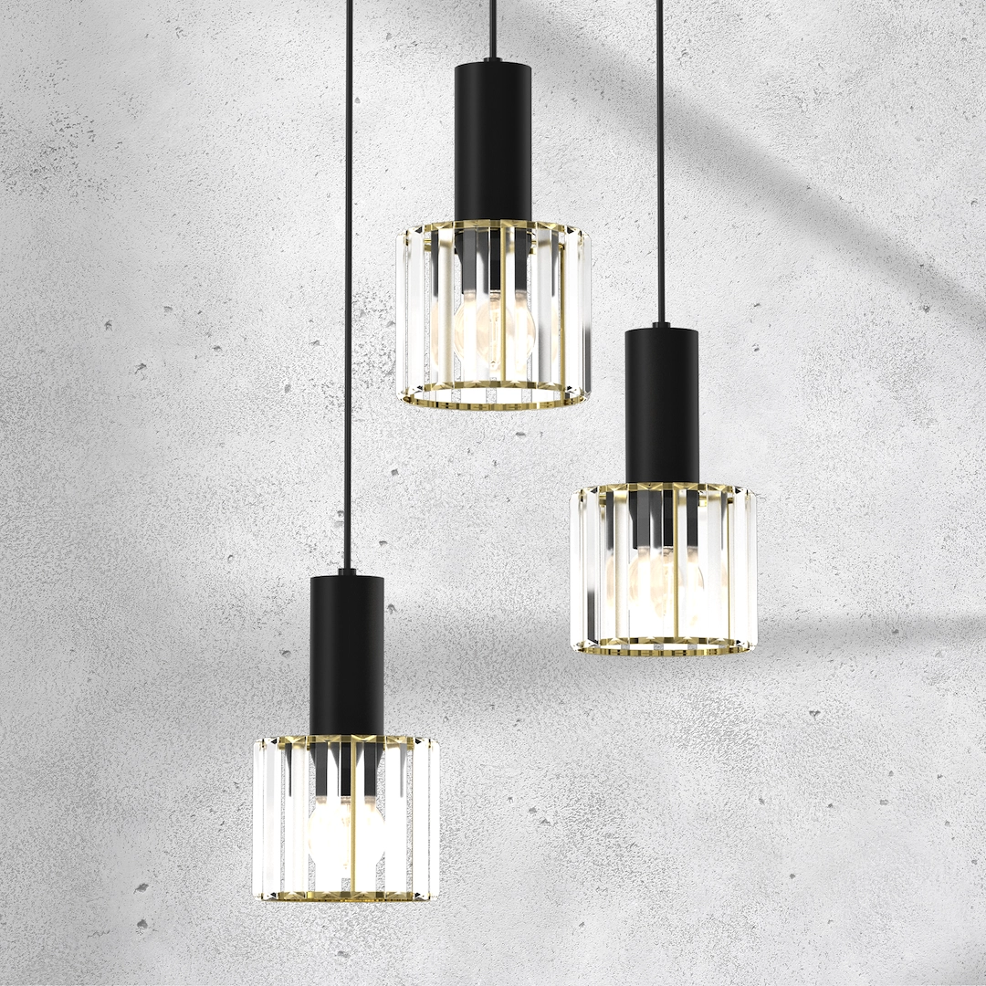 - Trzy kryształowe klosze – elegancki efekt świetlny
