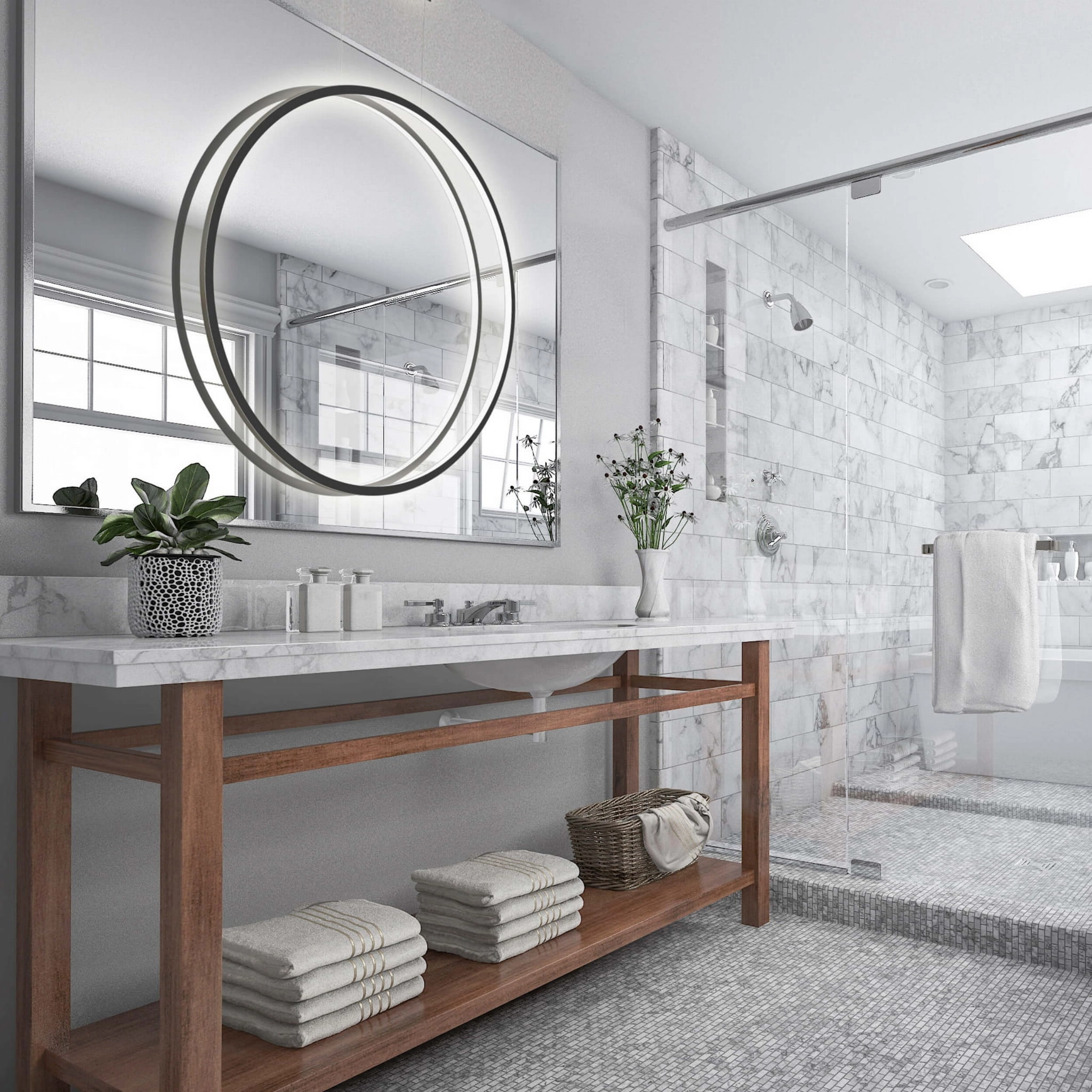 Wielu użytkowników boryka się z problemem nudnych, powtarzalnych aranżacji, w których brakuje kontrastu. Białe ściany i jasne meble często zlewają się w jedną całość. Industrialne koło LED w kolorze czarnym rozwiązuje ten problem, działając jak wyrazista klamra kompozycyjna. Dodatkowo, lęk przed parą wodną w łazience często zmusza nas do zakupu nudnych plafonów. Mirror S z klasą IP44 zmienia to oblicze, oferując nowoczesny apartament w stylu loft bez kompromisów w kwestii bezpieczeństwa.