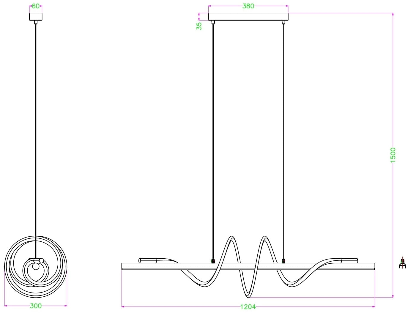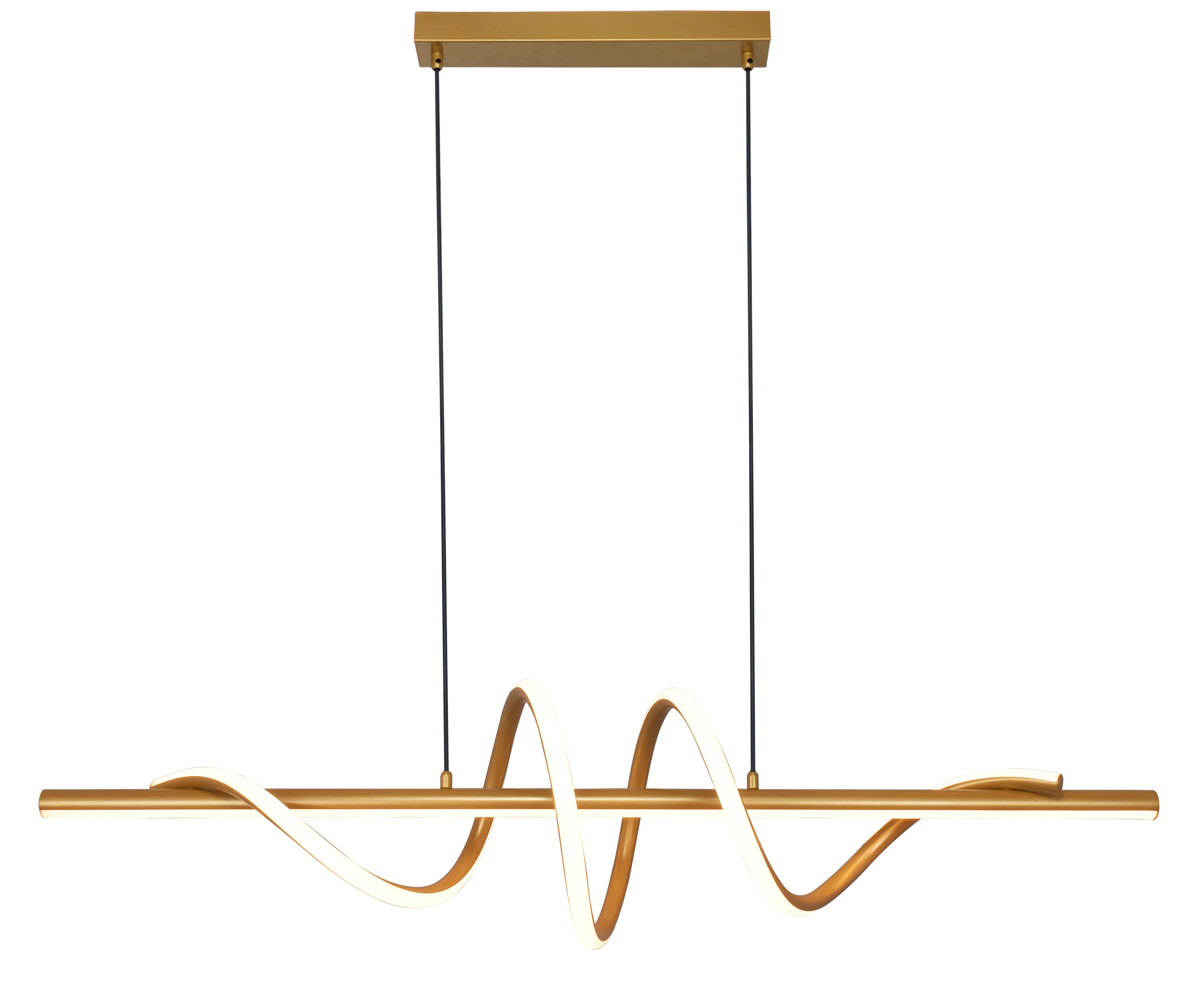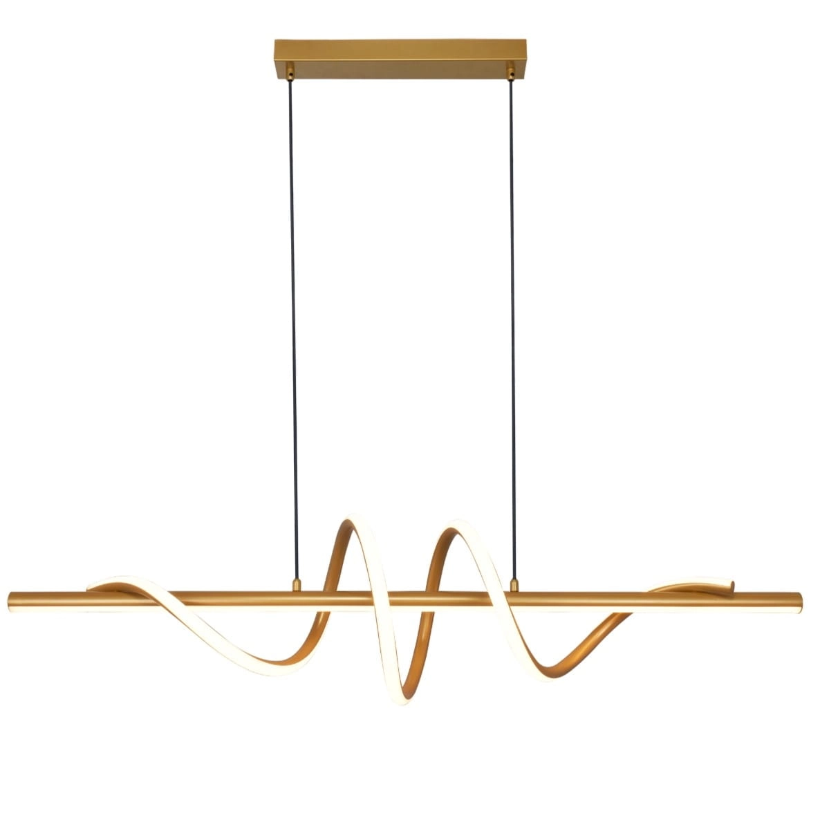 Lampa wisząca LED nowoczesna o dynamicznej, falistej linii to propozycja dla osób, które cenią odważny design i funkcjonalność w jednym. Model VELENNE łączy elegancki złoty kolor z energooszczędnym oświetleniem LED, tworząc efektowną lampę nad stół do jadalni lub designerskie oświetlenie do salonu. Wbudowane źródło światła 40W generuje aż 3150 lm, zapewniając mocne, a jednocześnie przyjemne ciepłe światło 3000K.