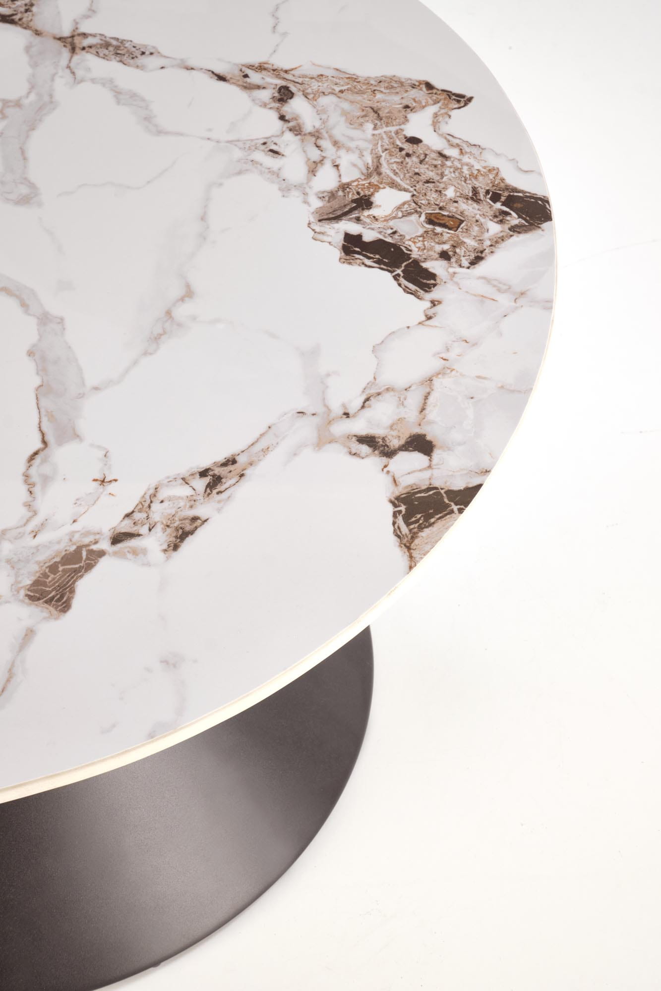 Stolik kawowy GORETTI to wyjątkowe połączenie nowoczesnego stylu z luksusowym wyglądem. Okrągły blat ze spieku kwarcowego w kolorze białego marmuru przyciąga wzrok, a czarna, stalowa podstawa nadaje mu stabilności i lekkości wizualnej. To idealny wybór do wnętrz, które stawiają na minimalizm, ale nie rezygnują z elegancji i funkcjonalności.