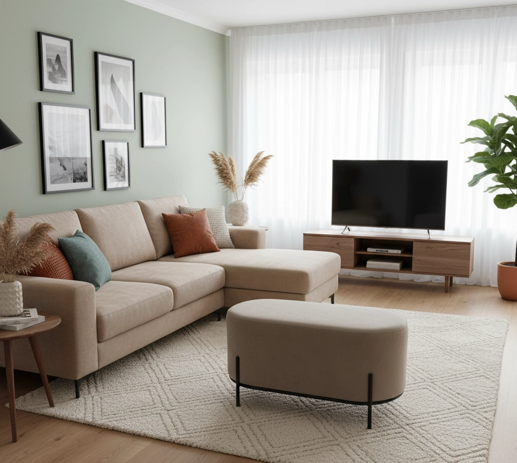 Neutralny, beżowy odcień ociepla przestrzeń i harmonijnie współgra z różnymi materiałami oraz kolorystyką wnętrza.