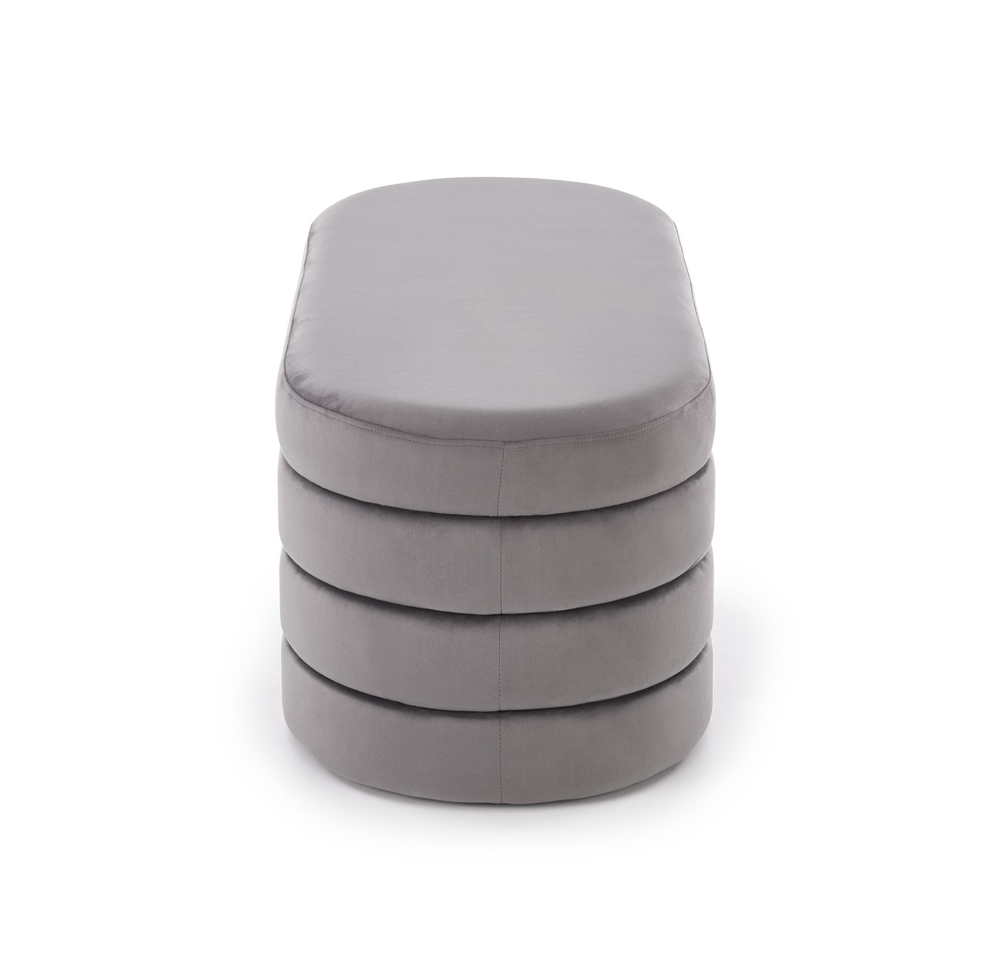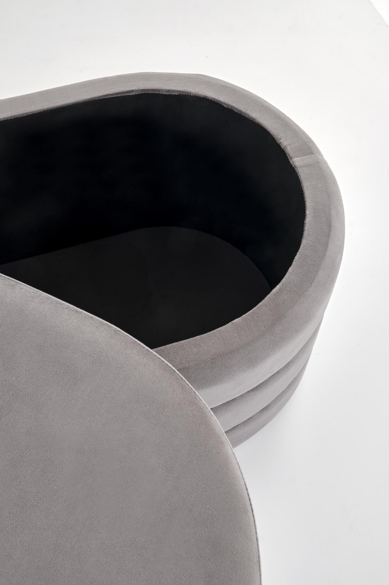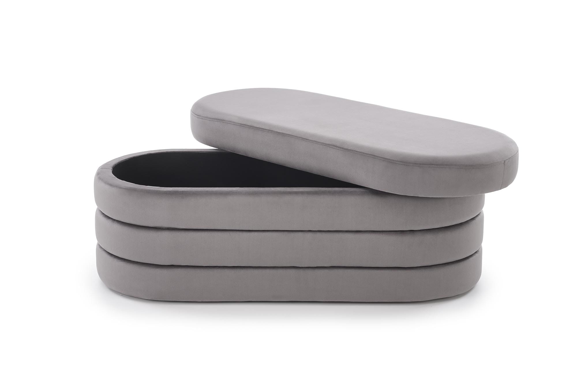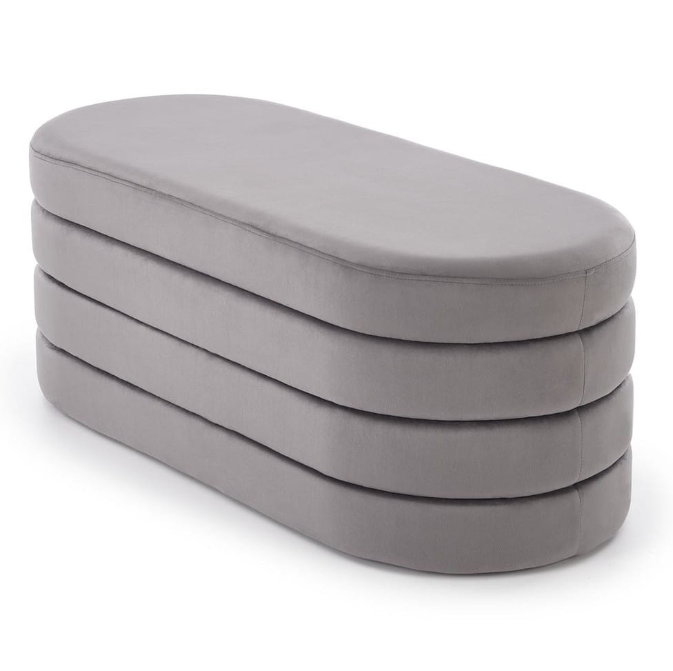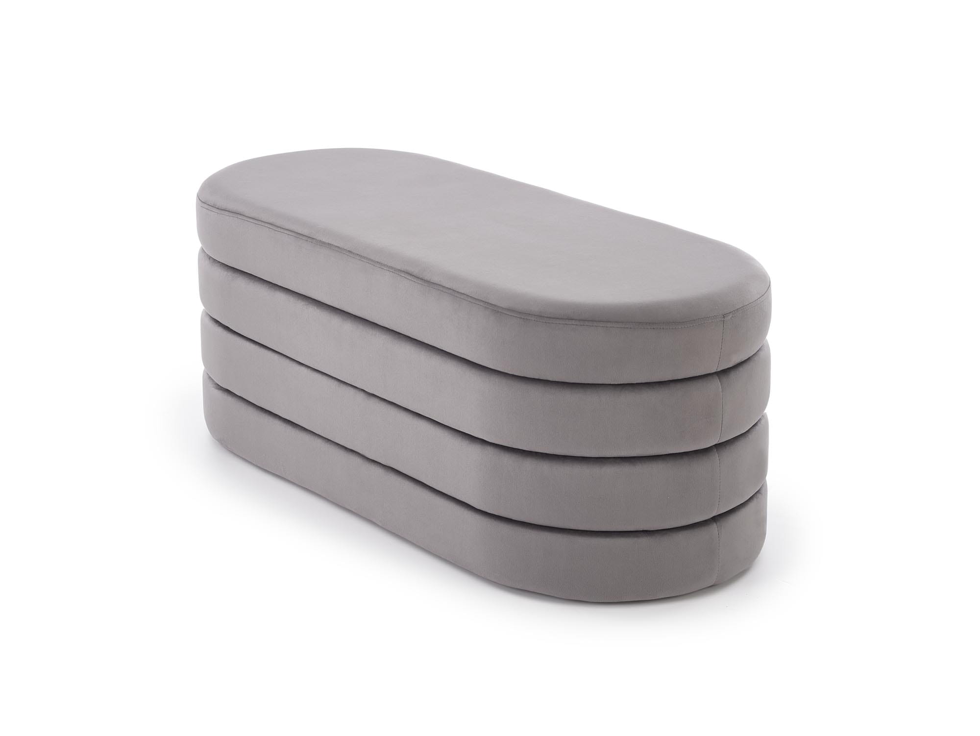 CALPI to stylowa ławka tapicerowana z pojemnikiem, która łączy dekoracyjny charakter ze sprytną funkcją przechowywania. Miękki welur w odcieniu szarym pięknie odbija światło i nadaje wnętrzu subtelny blask, a pojemny schowek pomoże utrzymać porządek – od szalików i czapek w holu, po pledy i poduszki w sypialni.