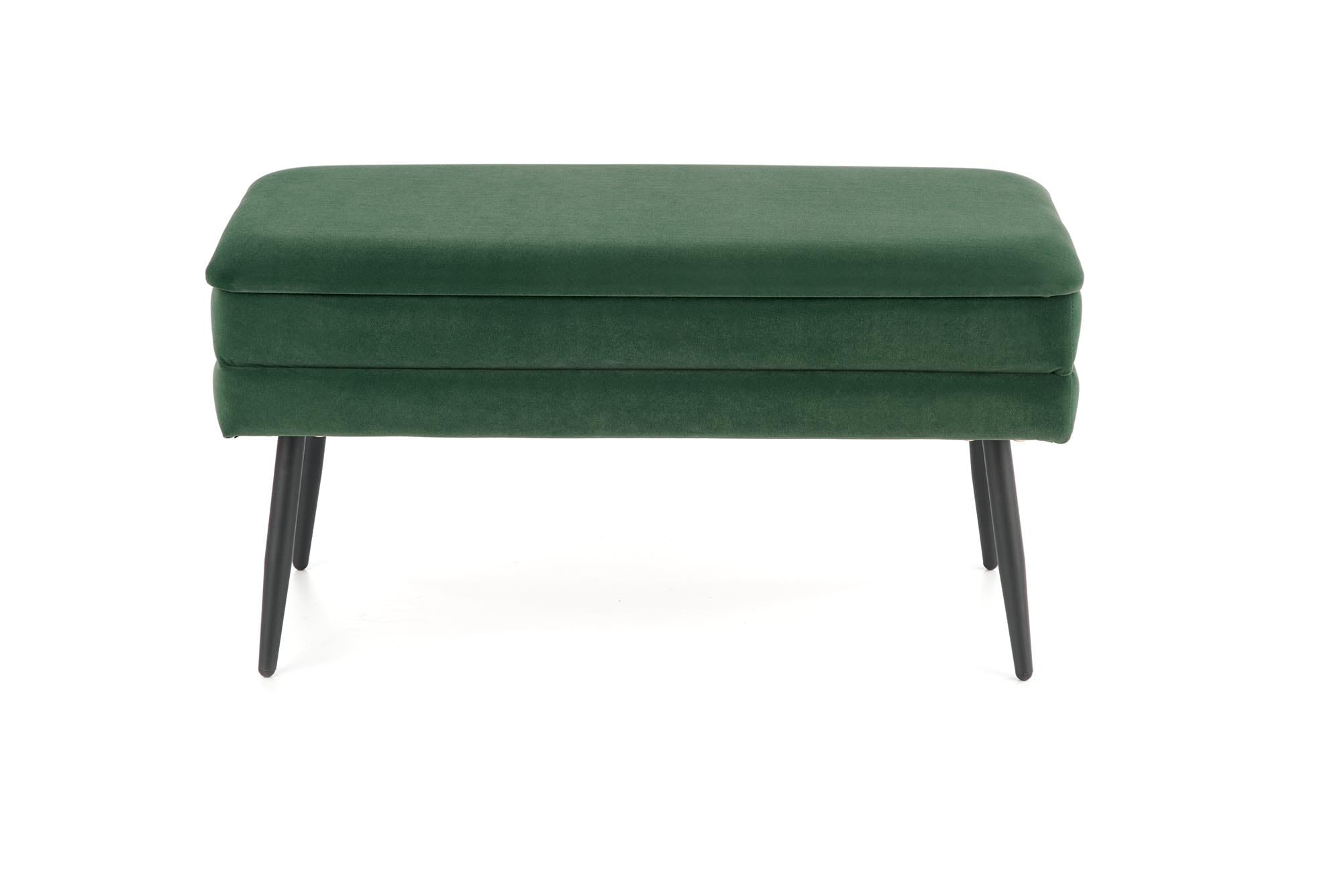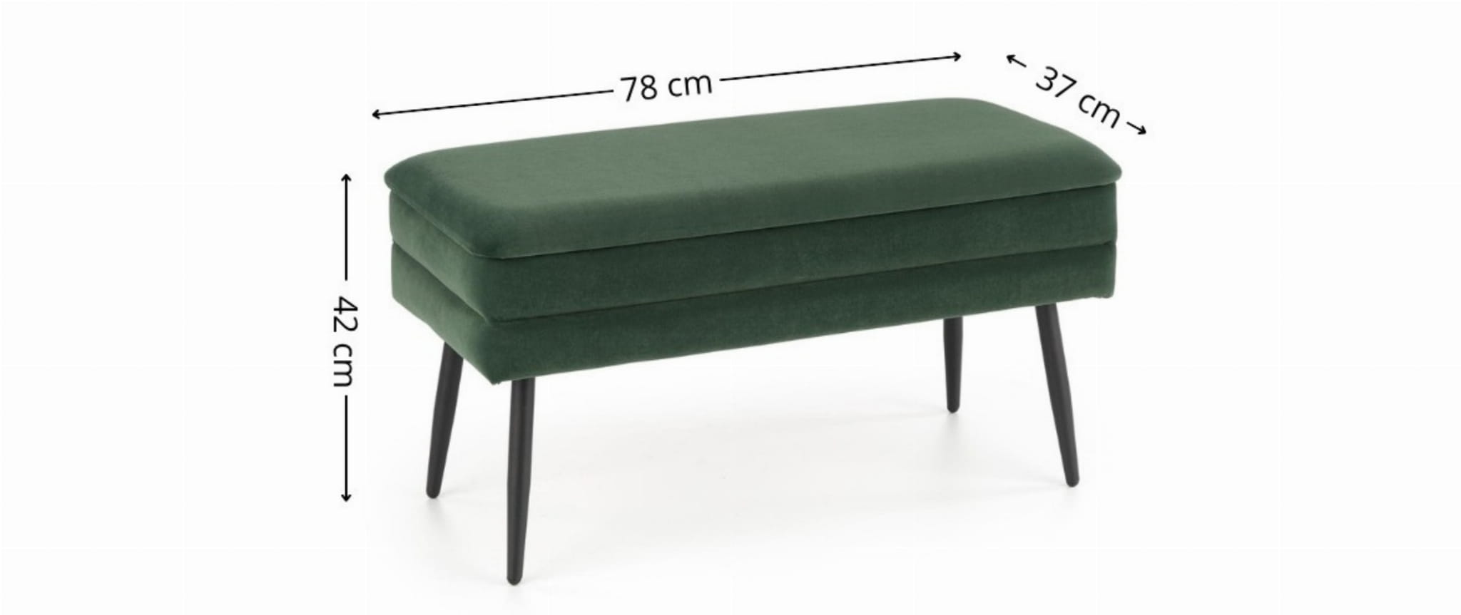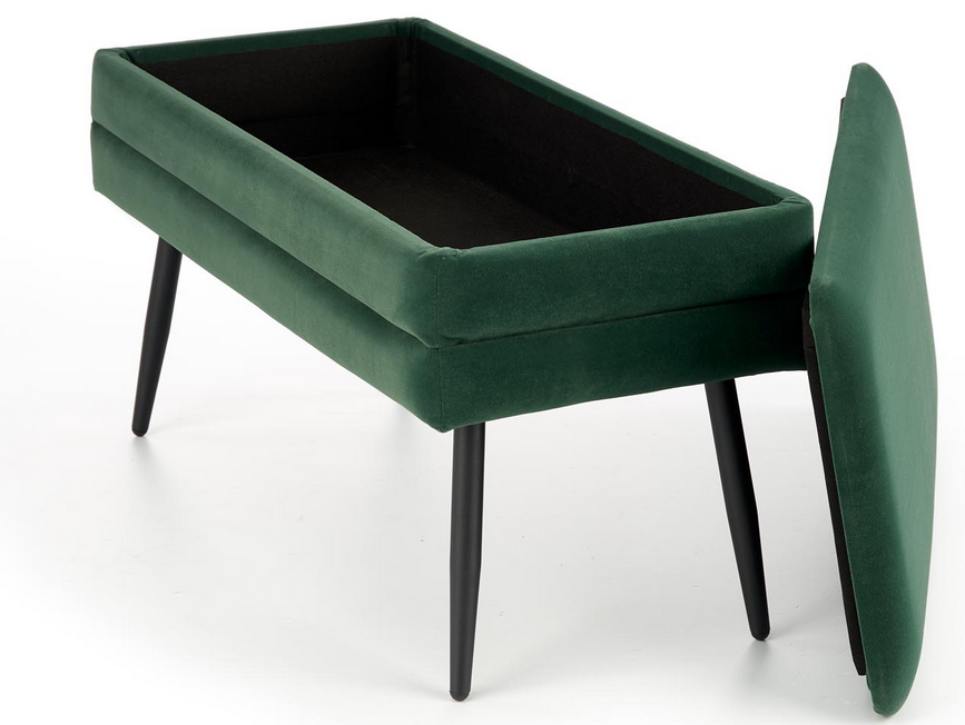 Ławka z pojemnikiem VELVA to stylowe i funkcjonalne rozwiązanie do każdego wnętrza, w którym liczy się zarówno estetyka, jak i komfort użytkowania. Obita modną zieloną tkaniną welurową, zachwyca subtelnym połyskiem i miękkością, a czarne stalowe nogi dodają konstrukcji lekkości i charakteru.