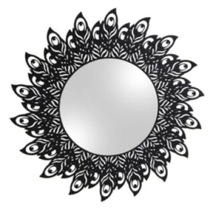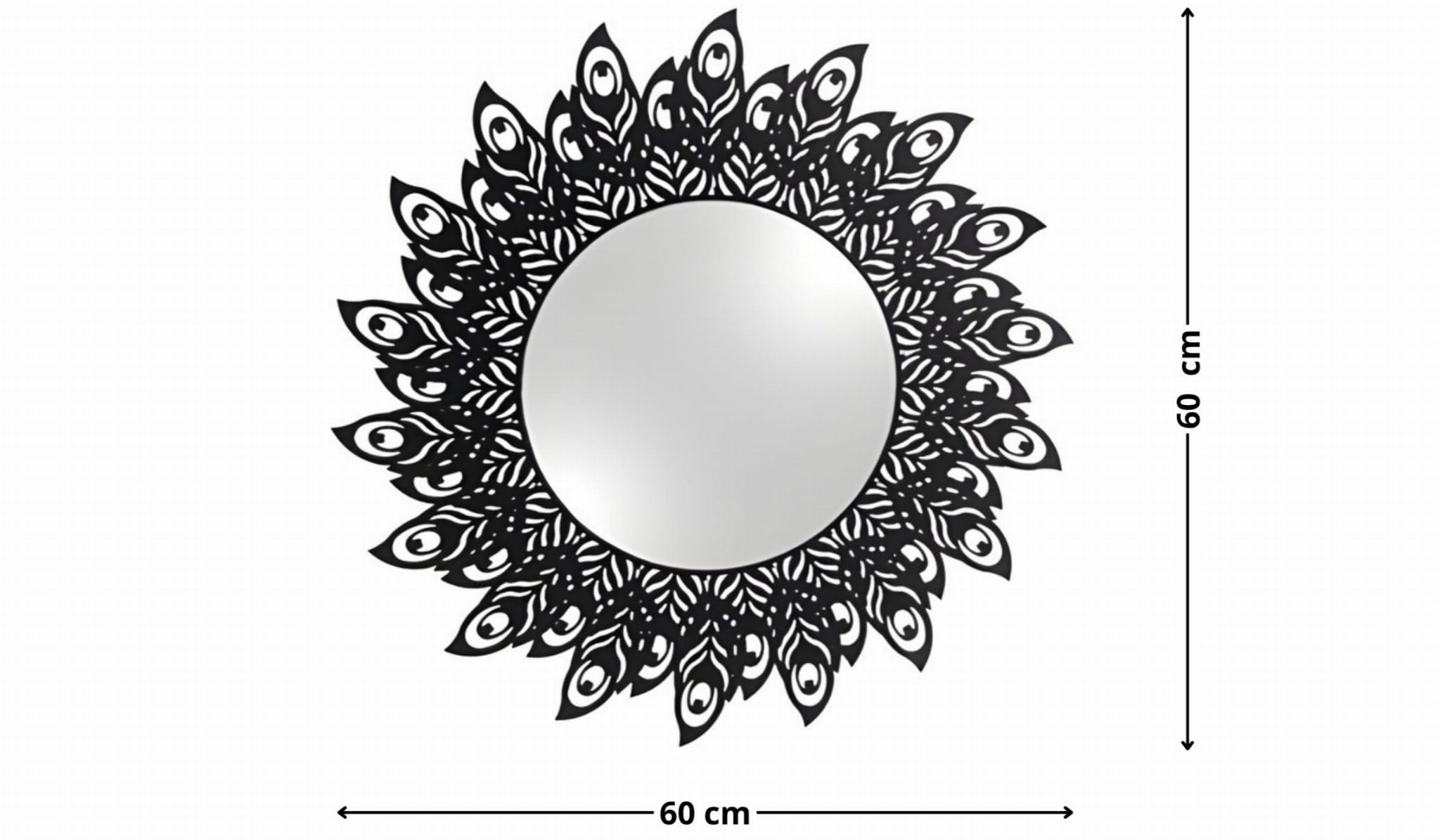 Lustro PEACOCK FEATHERS to połączenie dekoracyjnej formy z funkcjonalnością. Ażurowy motyw inspirowany piórami pawia tworzy efektowną ramę metalową w kolorze czarnym, a centralna tafla o średnicy 30 cm pięknie odbija światło. To lustro okrągłe 60 cm, które działa jak biżuteria ścienna – podkreśla charakter wnętrza i wizualnie je powiększa.