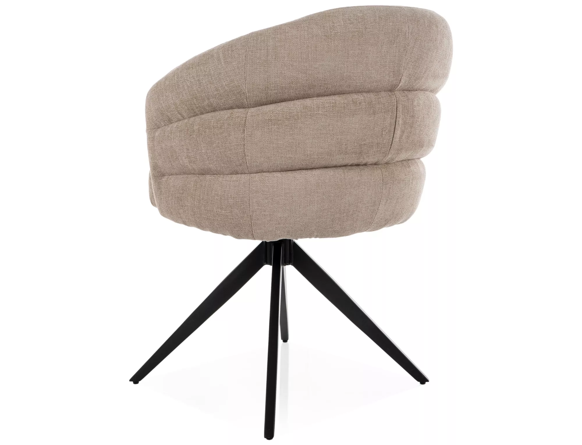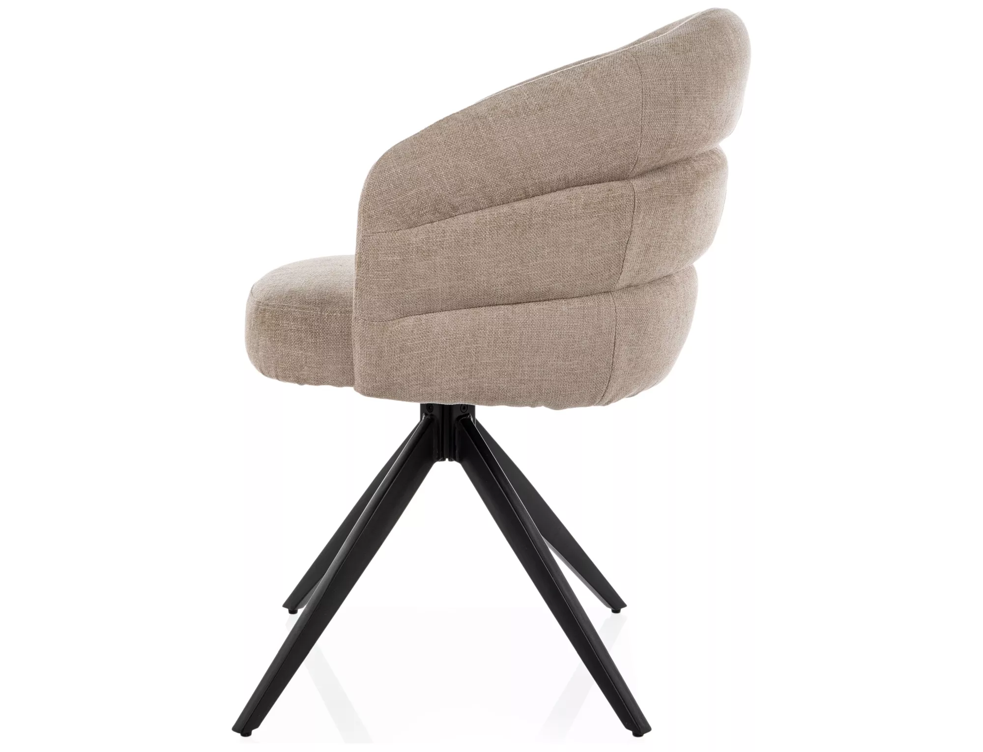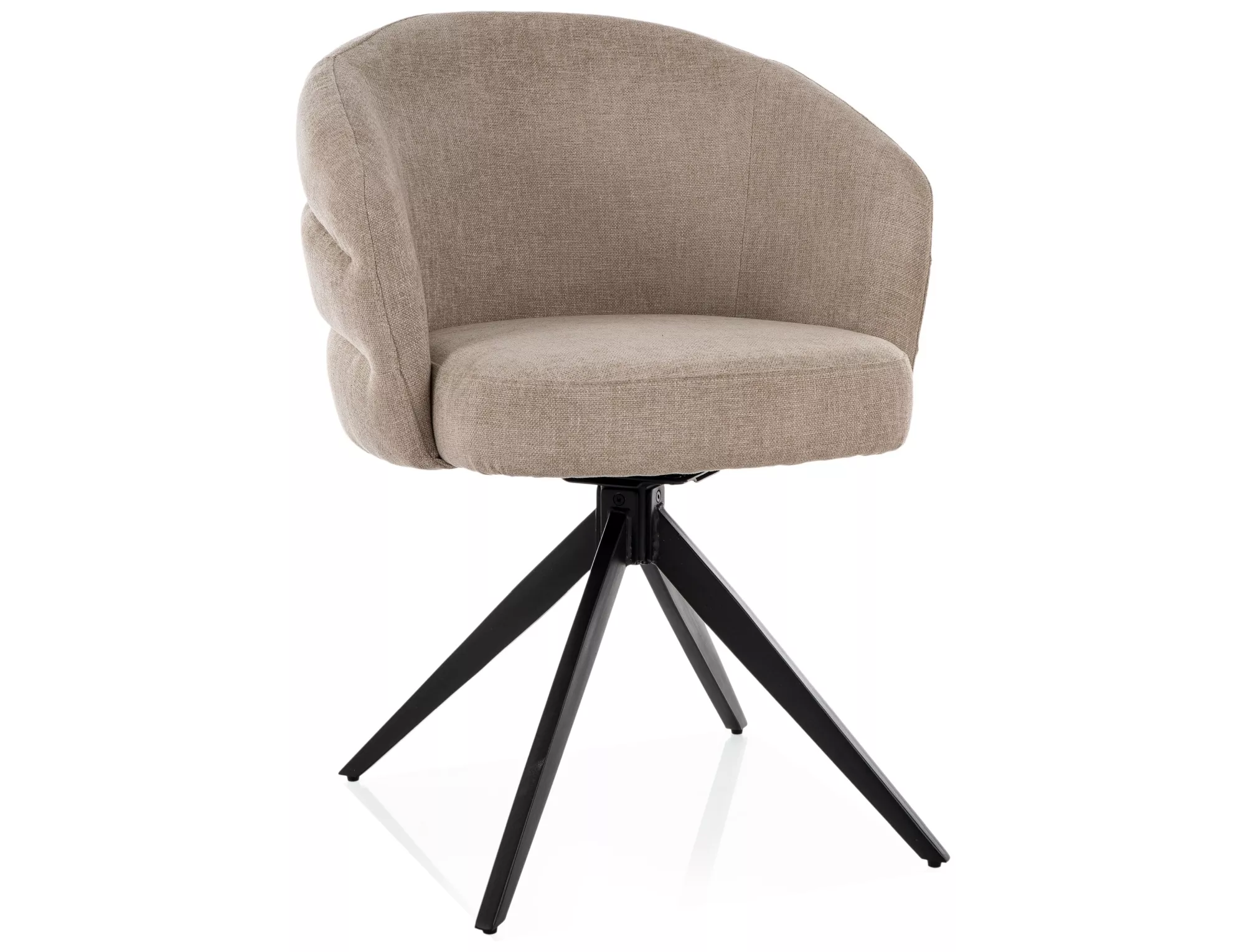 ORES to krzesło tapicerowane obrotowe, które łączy miękką formę, wygodę codziennego użytkowania i funkcjonalność ważną przy stole. To krzesło do jadalni z podłokietnikami dobrze odnajduje się także w salonie lub przy domowym biurku, bo daje przyjemne podparcie i pomaga zachować porządek w aranżacji. Beżowa tkanina, czarny stelaż i zabudowane oparcie sprawiają, że model wygląda nowocześnie, ale nie dominuje całego wnętrza.