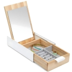Pokrywa z wbudowanym lusterkiem pozwala na szybkie sprawdzenie wyglądu biżuterii i sprawia, że organizer pełni również funkcję praktycznego lustra toaletkowego. Kompaktowy rozmiar umożliwia ustawienie go nawet na niewielkiej półce lub konsoli, a jego estetyczne wykonanie sprawia, że stanowi piękną ozdobę wnętrza.