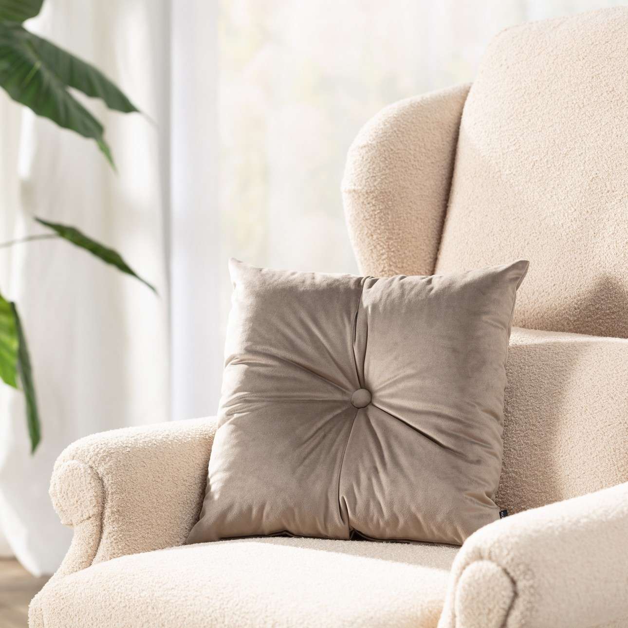✨ Beżowa poduszka kwadratowa z guzikiem velvet – elegancka, dekoracyjna, aksamitna poduszka do salonu i sypialni