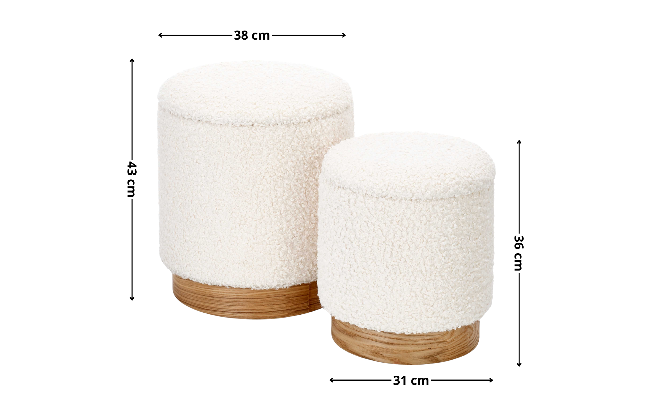 Każda z puf jest otwierana, co czyni z niej nie tylko siedzisko, ale i praktyczny pojemnik do przechowywania – idealny na tekstylia, akcesoria czy zabawki. Mniejszą pufę możesz w razie potrzeby schować w większej, co pozwala na oszczędność miejsca.