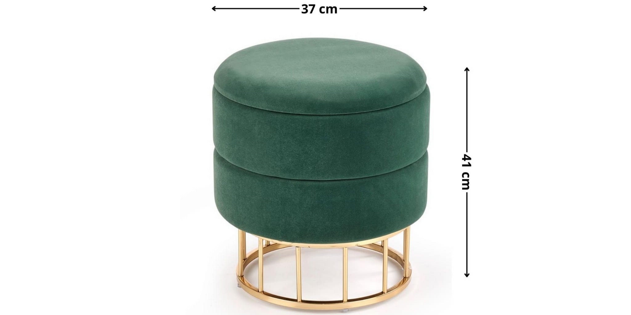 Pufa MINTY zielona to idealne połączenie praktyczności i stylu. Dzięki wbudowanemu schowkowi pomaga utrzymać porządek w domu, a jednocześnie pełni funkcję wygodnego siedziska lub podnóżka. Aksamitna tkanina velvet w modnym odcieniu zieleni dodaje wnętrzu przytulności, a złote nóżki nadają całości eleganckiego charakteru.