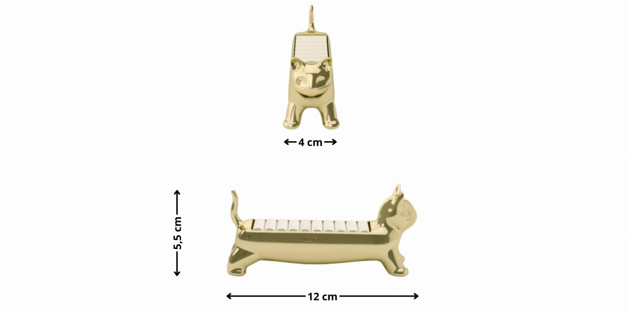 UMBRA KOT to stojak na pierścionki, który łączy funkcjonalność z wyjątkowym stylem. Złoty kolor i chromowane wykończenie sprawiają, że przyciąga wzrok i pasuje do eleganckich, nowoczesnych aranżacji. Dzięki stabilnej podstawie i kompaktowym wymiarom bez problemu zmieści się na toaletce, biurku czy półce w łazience, pomagając uporządkować i wyeksponować Twoje ulubione ozdoby.