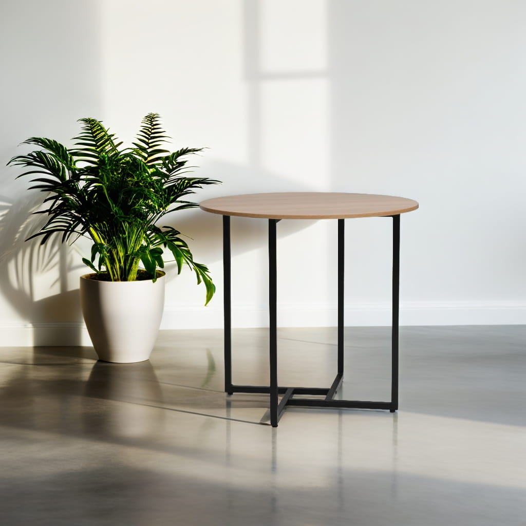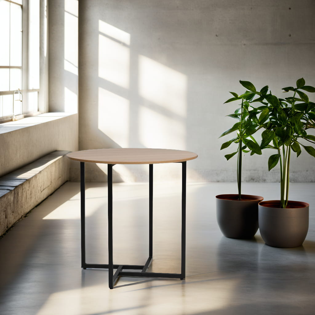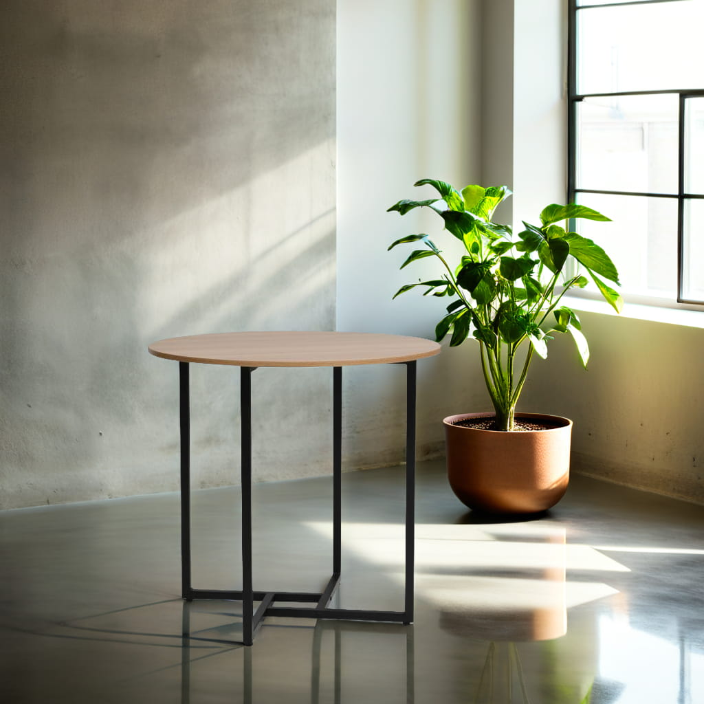 Laminowany blat w naturalnym wybarwieniu dębu nie tylko pięknie się prezentuje, ale także jest odporny na zarysowania, łatwy do utrzymania w czystości i codziennego użytku. Czarny, metalowy stelaż gwarantuje stabilność i trwałość na lata, a kontrastujące połączenie kolorów tworzy wyrafinowany efekt wizualny.