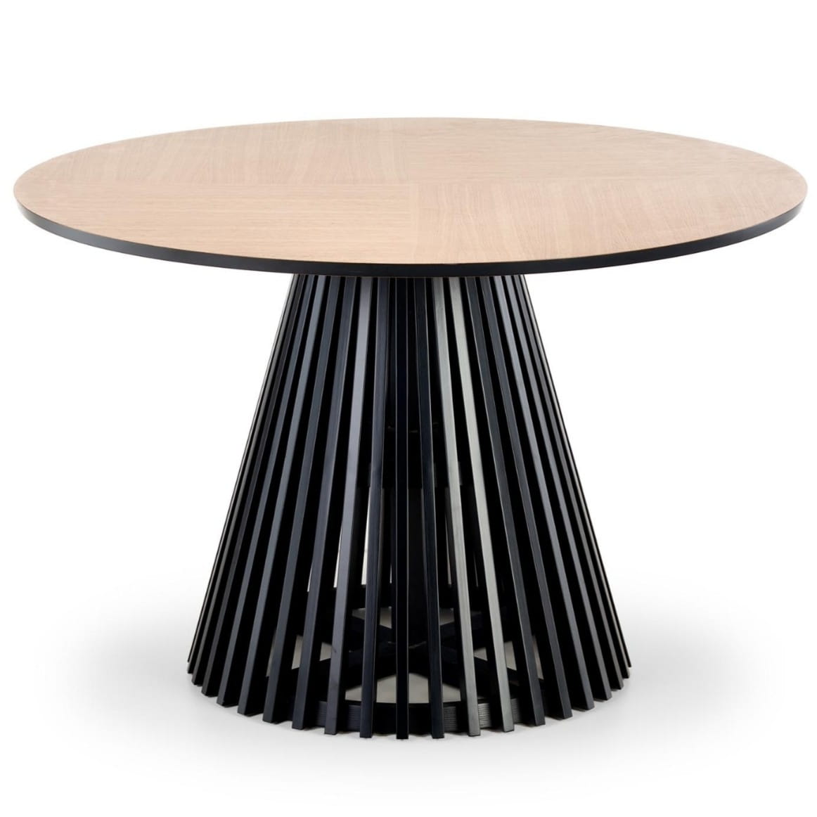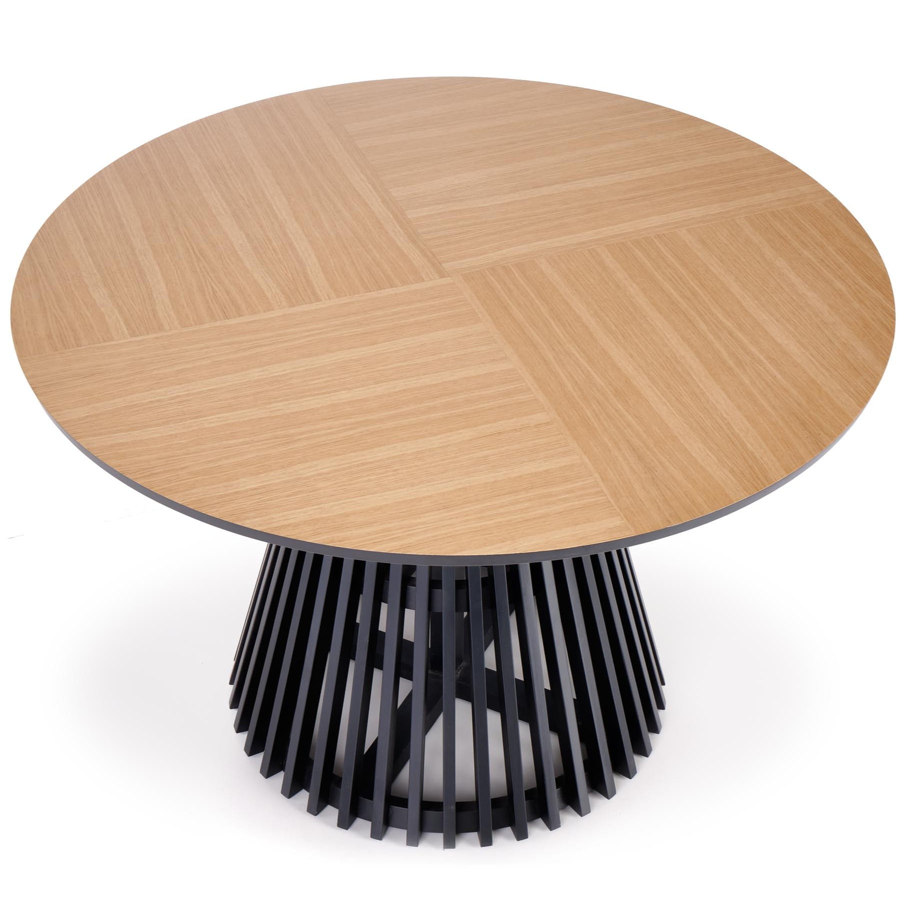 Okrągły stół MIYAKI 120 cm w kolorze dąb naturalny to połączenie szlachetnego drewna z nowoczesną formą. Dzięki naturalnej okleinie dębowej i solidnej czarnej podstawie tworzy on idealne centrum rodzinnych spotkań. To doskonały stół do jadalni dla osób, które cenią design, trwałość i harmonijny styl.