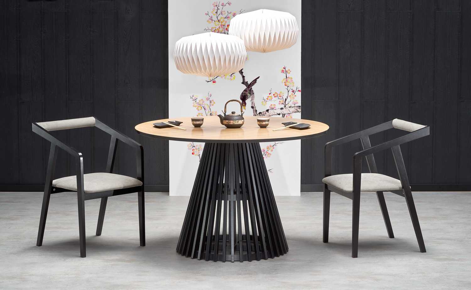 Model MIYAKI świetnie sprawdzi się w aranżacjach skandynawskich, japandi oraz nowoczesnych, wprowadzając do wnętrza ciepło, naturalność i elegancję. Duży, okrągły blat zapewnia wygodę podczas wspólnych posiłków, gwarantując komfort nawet dla 4–6 osób.