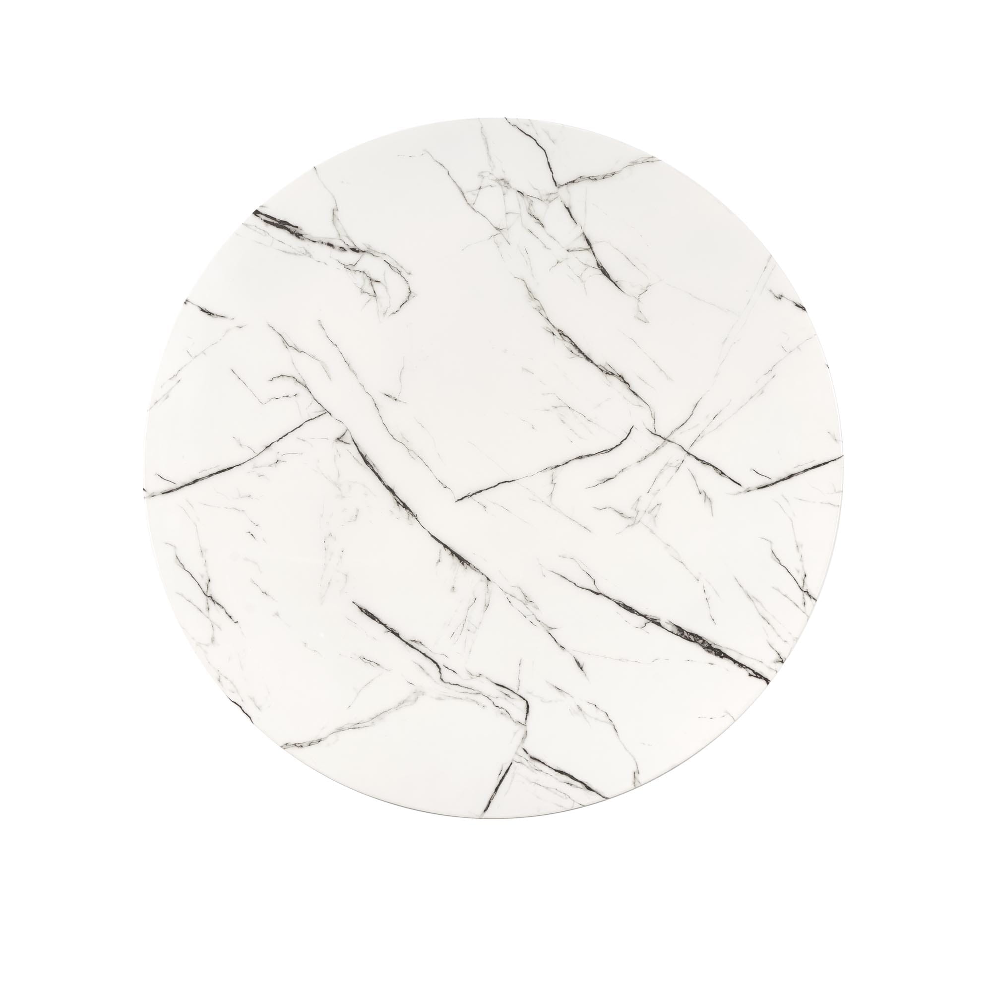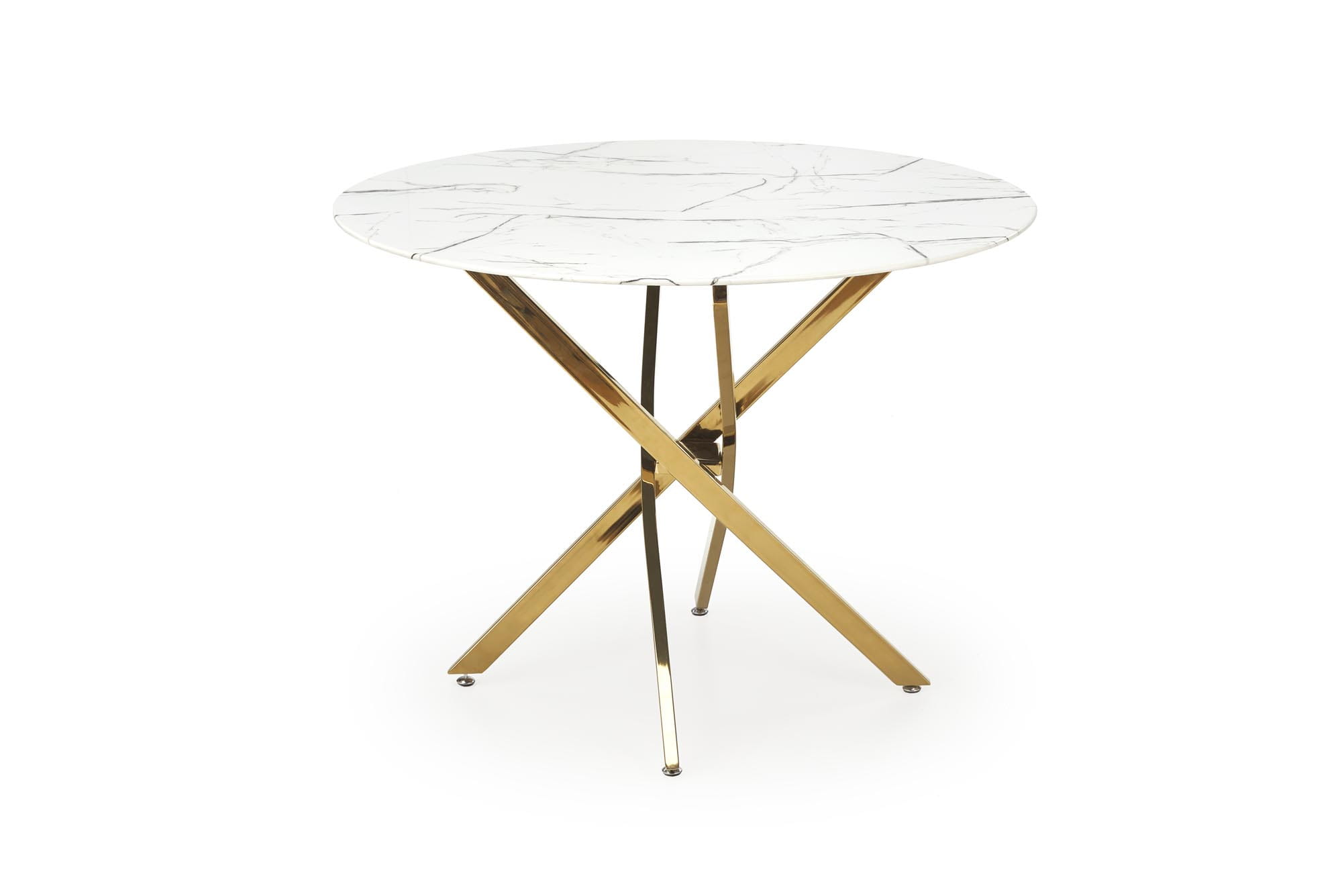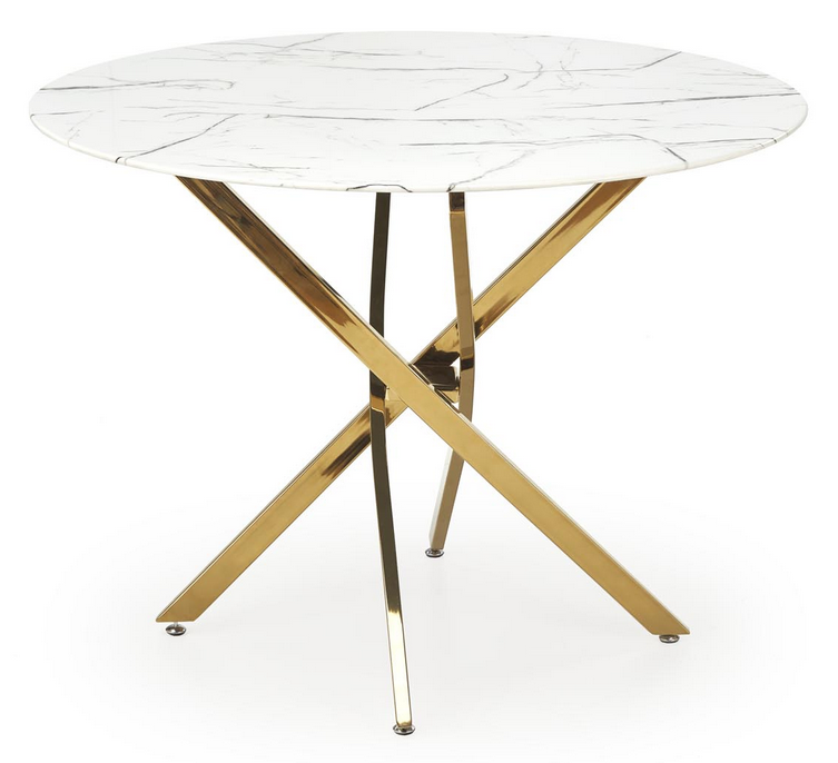 - Okrągły blat: Stół o średnicy 100 cm, pokryty białym marmurem, który dodaje luksusowego charakteru.