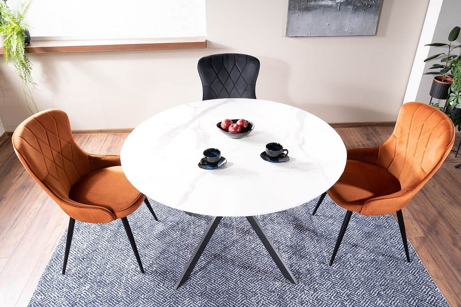 Okrągły stół TALIA z efektem marmuru to połączenie nowoczesnego designu i codziennej wygody. Średnica 90 cm sprawia, że jest idealny do mniejszych pomieszczeń, zachowując przy tym elegancki, ekskluzywny wygląd. Blat z ceramiki z efektem marmuru pięknie odbija światło, a metalowa podstawa w kolorze czarnym zapewnia stabilność i trwałość na lata.